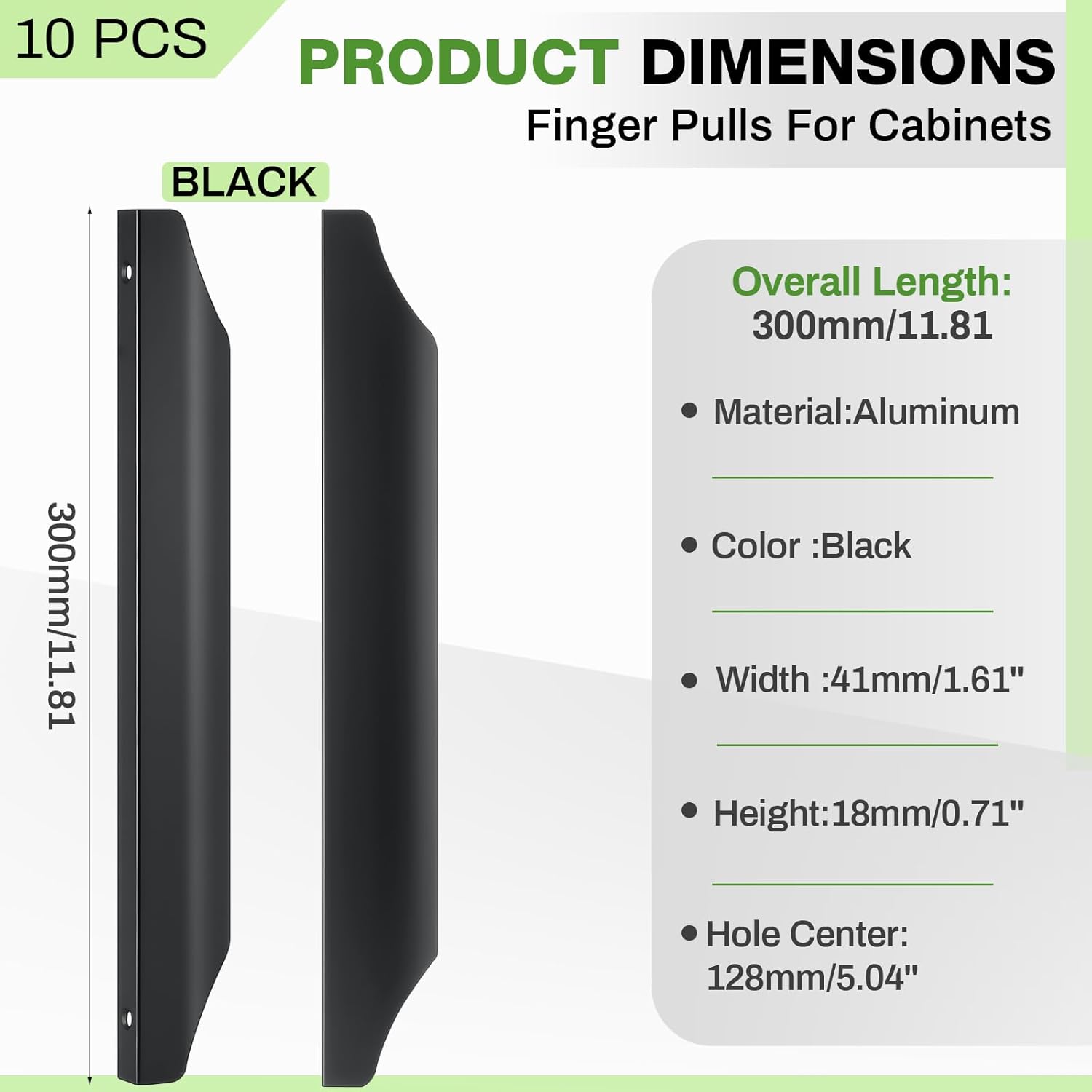 Features: The minimalist design seamlessly blends into any decor, offering a sophisticated and low-profile look. Ideal for those who want their cabinet finger pulls to complement rather than dominate their overall aesthetic. Their universal size makes them suitable as cabinet foot pulls, drawer pulls with backplate, or even as adhesive cabinet handles for easy application on various surfaces. Specifications: Material: Aluminum Color: Black Size: 11.81 inch Package includes: 10 x Finger Pulls Notes: Manual measurement, please allow slight errors on size. The color may exist a slight difference due to different screen displays