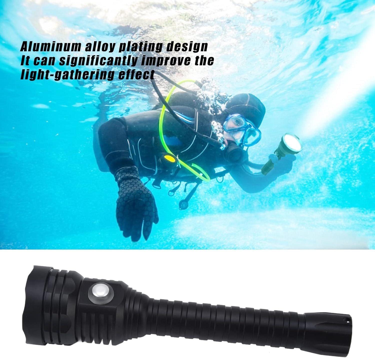 Specification:Item Type: Dive LightMaterial: Aluminum AlloyWeight: Approx. 394g / 13.9ozSize: Head Diameter Approx.5.8cm / 2.3in, Tail Diameter Approx.3cm / 1.2in, Length Approx.22.4cm / 8.8inLED: XHP70 Lamp BeadsBrightness: 10000LMLevel: Strong Light, Medium Light, Low Light, Flash (Double Click)Battery: 2x18650 Batteries (Battery Not Included)Light Source: White LightMaximum Range: Approx. 500meter / 546.8ydWaterproof Depth: Approx. 100m/109.4yd UnderwaterWaterproof Level: IPX8Package List:1 x Flashlight (Battery Not Included)1 x Sling2 x Waterproof Rings