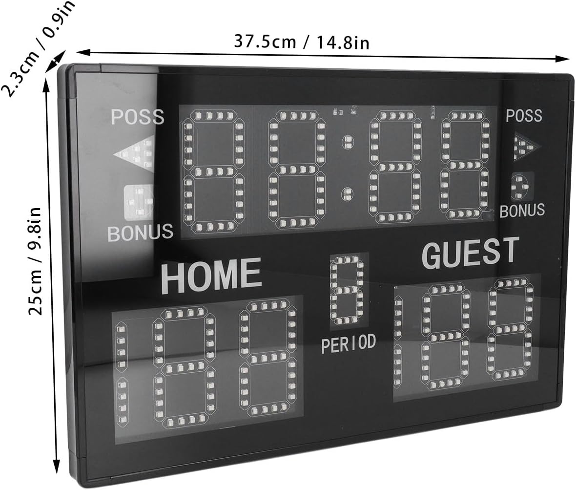 Specification: Item Type: Electronic Scoreboard Model: GA30B Scoreboard Power Supply: DC 5V or 3 Lithium Ion Batteries (not included) Remote Controller Power Supply: 2 x AAA Batteries (not included) Scoreboard Size: Approx. 37.5 x 25 x 2.3cm / 14.8 x 9.8 x 0.9in Scoreboard Display: 1. Single period match time, countdown timing, editable. Display format is (minutes: seconds) when greater than 1 minute, and (seconds: milliseconds) when less than one minute. 2. Games quarters display, from 1 to 9. 3. HOME score and GUEST score display, maximum value displayed is 199. 4. Fouls count display 0 to 9 times. 5. Pause count display 0 to 4 times. 6. Attack time display (single attack time editable, remote controller can reset to 24 seconds, 14 seconds, 12 seconds, and custom attack time). 7. Attack direction indicator arrow display How to Use: Follow the instructions in the manual after taking out the product Package List: 1 x Scoreboard 1 x Remote Controller 1 x Power Cable 1 x Stand 2 x Hooks 2 x No Drilling Hooks 6 x Screws 2 x Expansion Screw 1 x User Manual Notice: For indoor use only, not