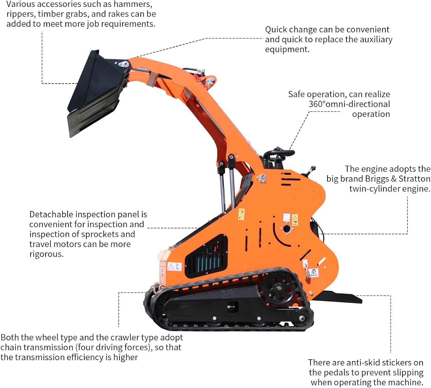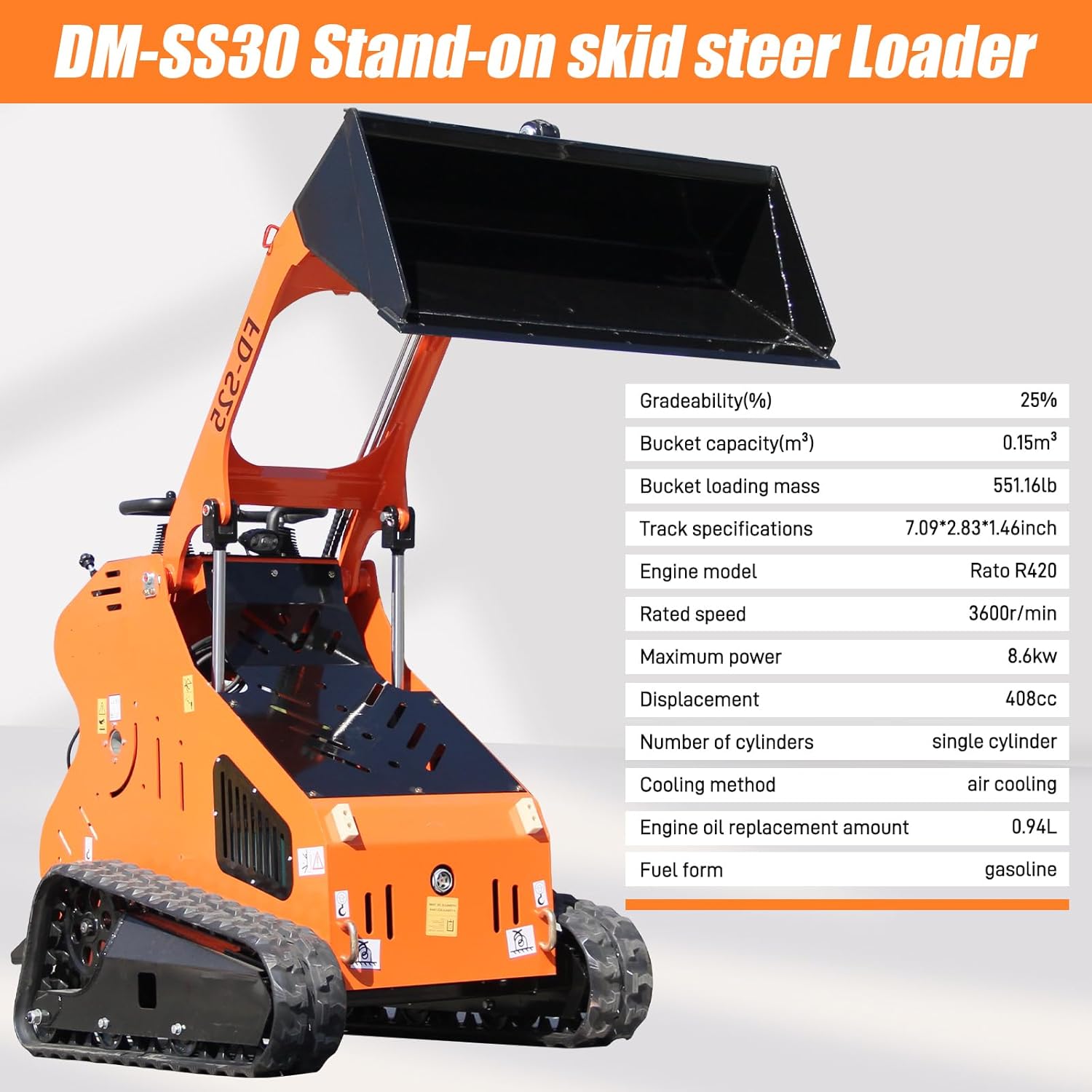 DigMaster Mini Skid Steer Loader – Built for Real Work in Tight Spaces. Whether you're clearing land, moving material, or tackling yard work, the DigMaster Stand-On Mini Skid Steer Loader delivers serious performance in a compact, easy-to-maneuver form. With a working weight of 1587.33 lb and lifting force up to 826.73 lb, this machine handles heavy-duty tasks without compromising flexibility. It features a 39.37-inch bucket with a 0.1m³ loading capacity, making it ideal for landscaping, farming, or light construction. The 25% climbing ability, ground clearance of 5.91 inches, and 0–6.5 km/h variable speed allow smooth operation on rough or sloped surfaces. Its 15HP gasoline engine with forced air cooling ensures consistent power for continuous use. Whether you’re navigating narrow barns or operating in urban construction sites, the 51.97-inch turning radius and 32.83-inch boarding width provide unmatched agility. From digging and hauling to plowing and clearing—this machine gets the job done.