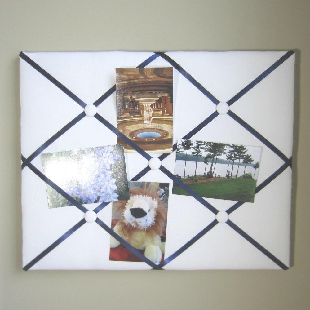 A 16"x20" memory board that is both classic and modern. The white fabric is accented with a navy blue satin ribbon and white buttons in a matching fabric. Handmade fabric memory boards are designed to be used without tacks or push pins. Great for: *Organizing photographs (your own or all those Christmas photo cards!) *Organizing business cards *Hanging hair accessories or jewelry *Safely storing your household bills *Organizing the million slips of paper covering your desk! This memory board is made with designer fabrics and top quality materials. The back is finished with a felt back and ribbon. Each memory board has a saw tooth hanger on the vertical and horizontal sides. Because each memory board is made to order fabric placement may vary.
