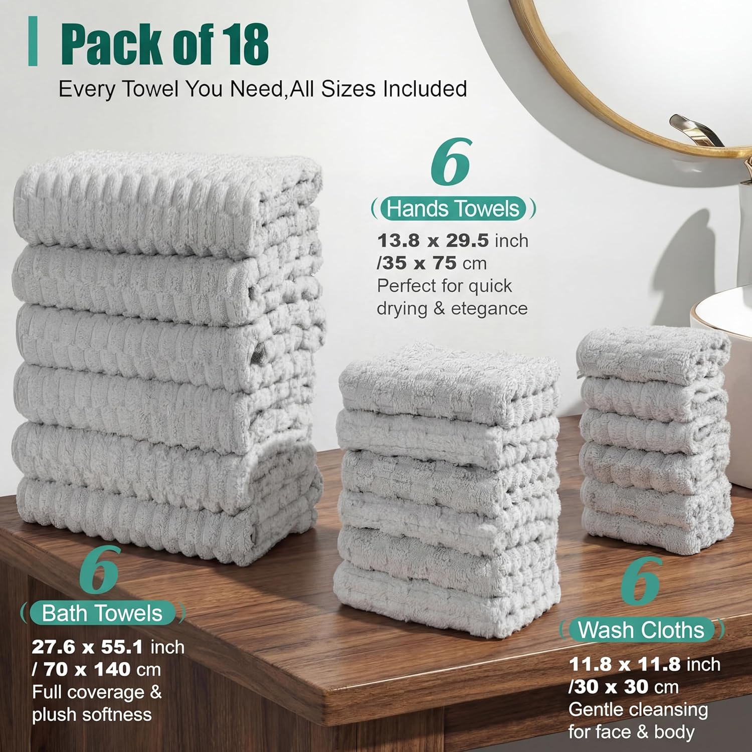 Features: Spa level quality: Hotel grade weight and texture, our bath towel sets multiple pack provide long lasting durability and cloud-like softness. Versatile gift idea: Our microfiber bath and hand towel set is a thoughtful gift for anyone—from Mother's and Father's Day to Valentine's and Christmas. Specifications: Material: microfiber, coral fleece Color: gray Size: large bath towel is about 27.6 x 55.1 inch/ 70 x 140 cm, hand towel is about 13.8 x 29.5 inch/35 x 75 cm, washcloth is about 11.8 x 11.8 inch/30 x 30 cm Package includes: 6 x Large bath towels 6 x Hand towel 6 x Washcloth Notes: Manual measurement, please allow slight errors on size. The color may exist a slight difference due to different screen displays