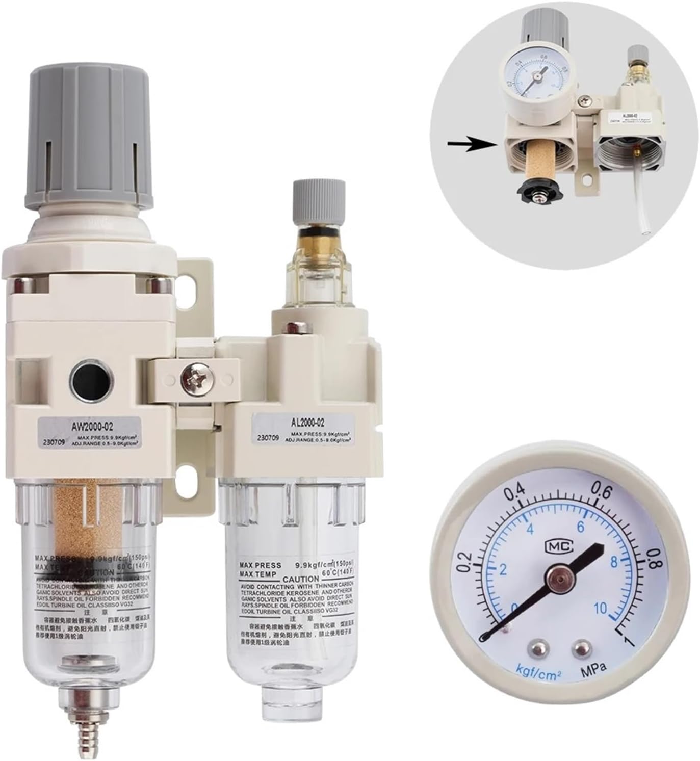 filterOil Filters1pcs AC2010-02 Compressed Air Compressor Water Filter Drain Air Component Processor Treadment Pneumatic Tool Tools G1/4Specification:Item No.: AFC2000Type: Air FilterWorking Media: Clean AirFilter Precision: 40m (Normal) Filter Cup Capacity: 15mlPort Size: Inlet==1/4 Gage=1/8Drain Mode: -Automatic/ Overpressure self-drainingNormal Operating Pressure: 1.5~8kgf/cm²(0.15~0.8MPa/1.5~8bar)Max.Operating Pressure: 1.5MPa(15Bar)Ambient And Fluid Tempereatul: 5~60 (41~140)Suggested Lubricating Oil: ISO VG32 OilBody Material: Aluminum AlloyCup Material: PCInstallation Instructions:InstallationGrasp the tubing and slowly push it into the fitting until it comes to stop. The tubing will be locked by the spring gasket.RemovePush the release button to open the spring gasket so that the tubing can be released.Cautions:1. Cleaning: Clean the piping before connection to remove debris.2. Tubing Cut: Ensure a perpendicular cut without scratches on the tubing's outer diameter.3. Pipe Length: Avoid excessive bending; select a proper pipe length.4. Connection: After connecting pull the tubing gently to check its seal.5. Release: Push evenly on the release button flange for proper tubing withdrawal.6. Removal: Avoid rotating the tubing fully during removal.7. Assembly: Ensure no debris enters when screwing pipes and fittings together.Safety Instructions:1. Pressure: Ensure zero pressure in the tubing before removal.2. Spatter Zones: Avoid standard fittings in spatter-producing areas.3. Monitor Conditions: Stay within specified pressure and temperature ranges.4. Environment: Avoid corrosive gases chemicals and extreme conditions.5. Placement: Avoid areas with heavy vibrations or shocks.6. Direction: Install tubing in the correct one-way direction.