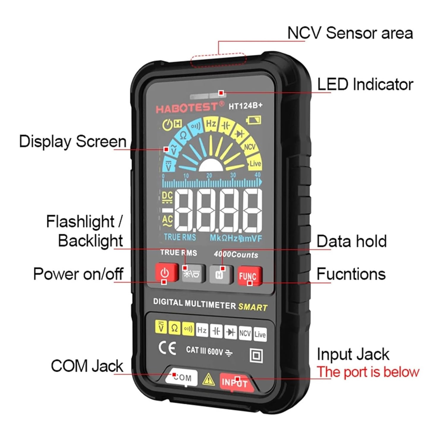 Multimeters==========Measuring Capacitance Range : 4nF-4mFOperating Temperature : 0 - 40 DIY Supplies : ELECTRICALMeasuring Resistance Range : 4000-40M OhmModel Number : HT124AC Voltage : 4V/40V/400V/600V Voltage : 400mV-600VDisplay Type : Digital display