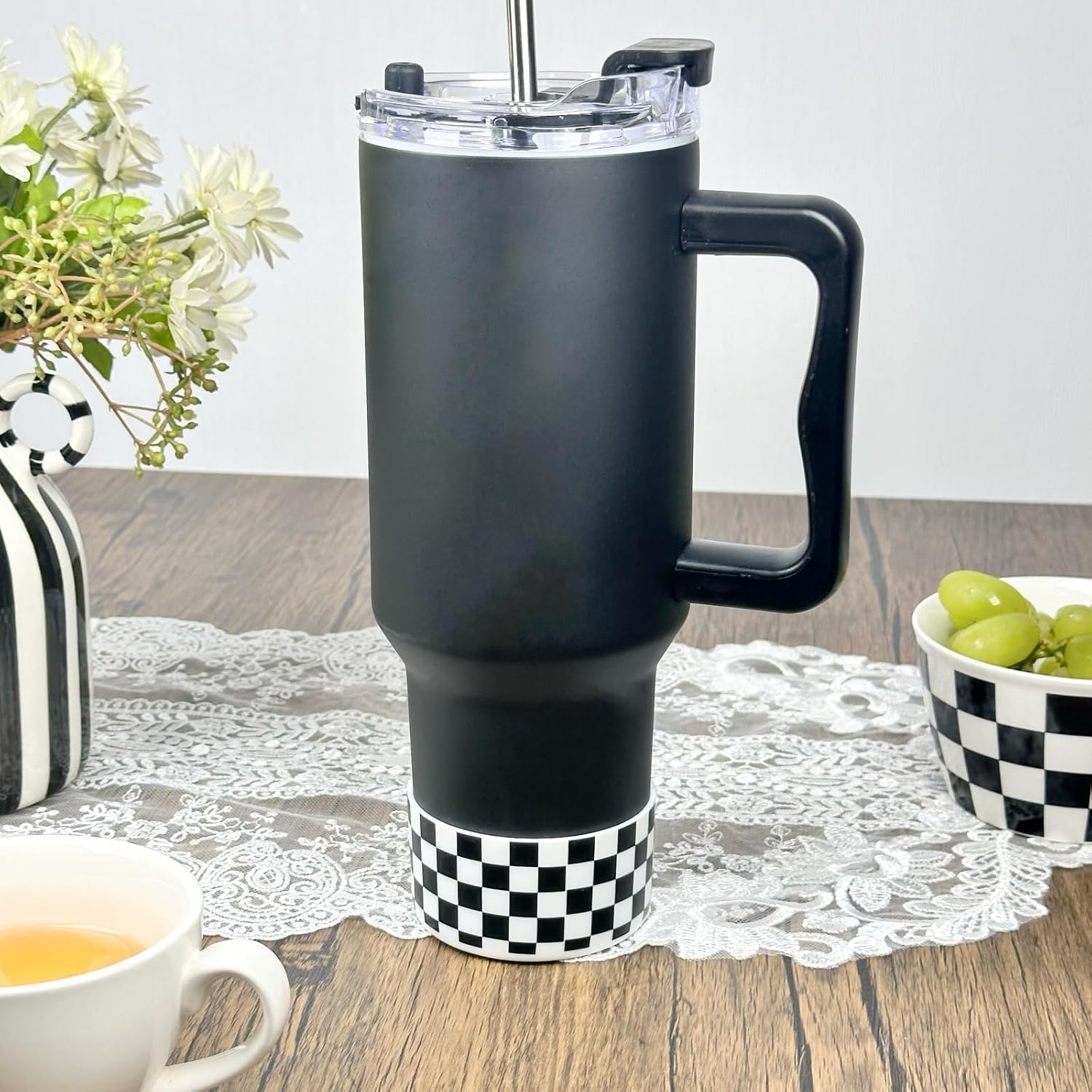 NAKOR HOME 2 PCS Checkered Pattern Protective Silicone Boot Cover for Stanley Cup 20oz-40oz, for Hydro Flask Water Bottle 12oz-24oz, Anti-Slip Sleeve for Bottles/Tumblers with 2.88-2.97in Bottom,Black and White