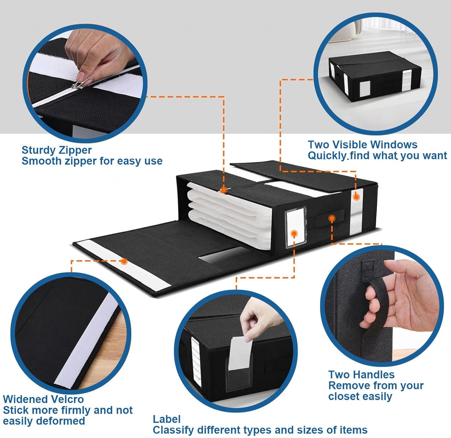 Why choose our bed sheet organisers and storage?The closet organiser can be used to store quilts/sheets/clothes/towels and other household items.Each foldable bedding sheet set organizer is super easy to use; You can fold your sheets first and put them in the center, then zip, close, label and finish1.Dual handles, with handles in both positions, easy to take out from inside the wardrobe.2.Double see-through window, you can see what's stored inside without opening it.3.Double name card frame, you can keep track of the stored items in time.4.High viscosity Velcro, can effectively keep the closure state.5.Smooth zip, no jamming situation.Product material: Imitation linen fabric + cardboardSize:38*32*11.5cm/ 14.96*12.59*4.52 inchesProduct packaging includes:under-bed storage containers*2Make your linen closet neat and organized with this foldable bed sheet organizer, which can help you organize your closet efficiently and quickly. It is an essential tool in your life!Please note:The dimensions are all measured manually, there may be slight errors, which will not affect normal use.