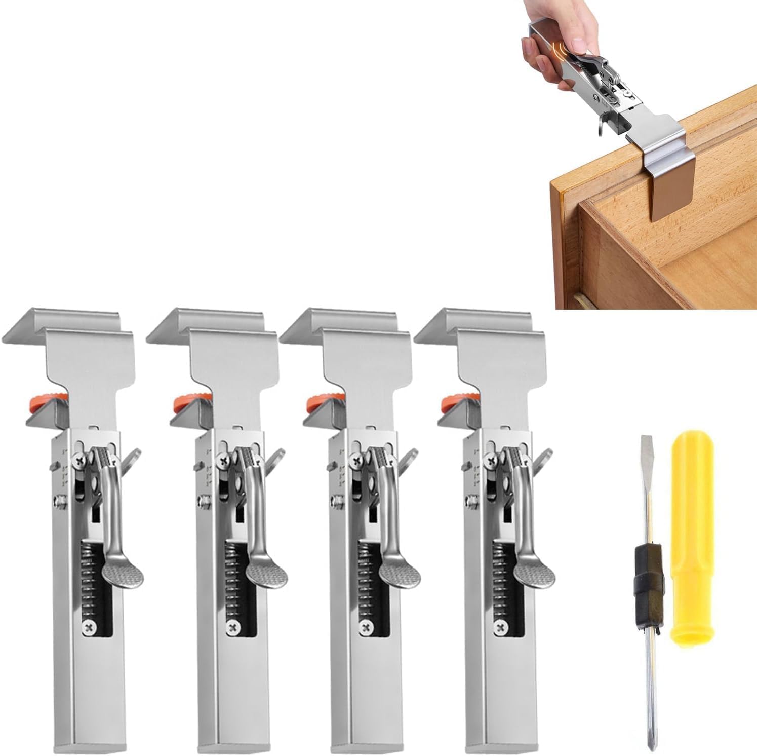 Product DescriptionSpecifications: Material: Stainless Steel Head Thickness: 2mm Package: 1/2/4 x Adjustable Drawer Fixing Clamp