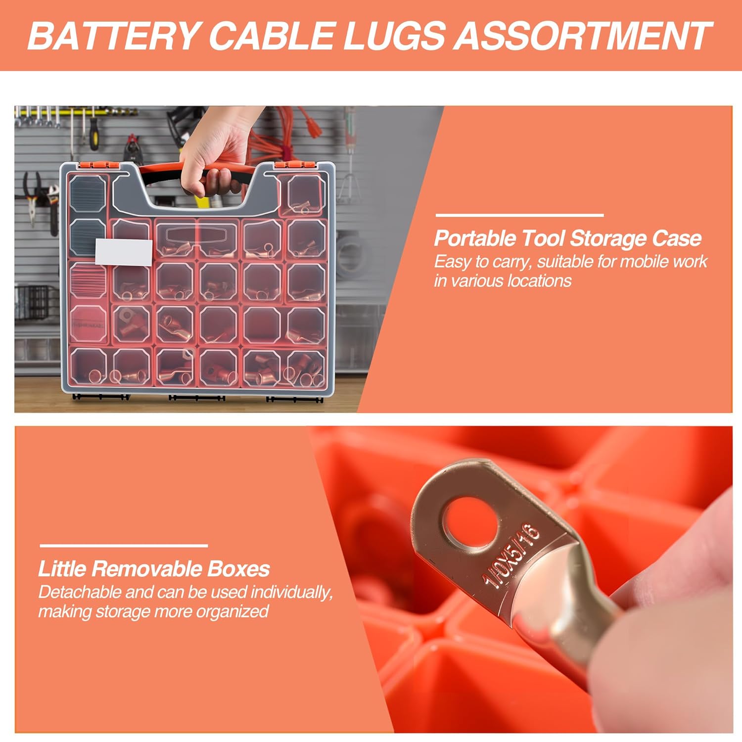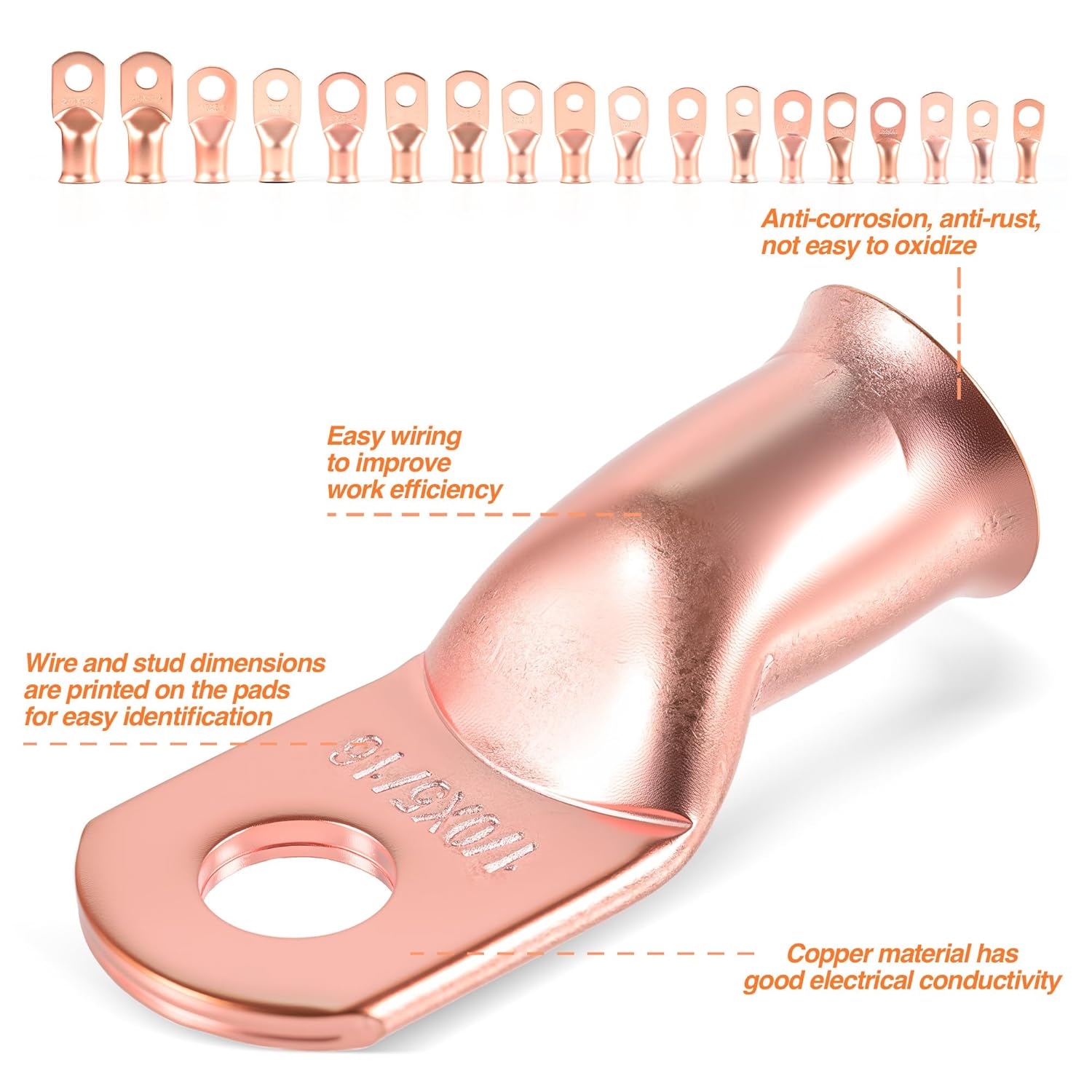 SPECIFICATION-Item Dimensions: 12.4 x 10.83 x 2.4 in-Item Weight: 4.59 pounds-Material: copper, plasticPACKAGE:;220PCS Battery Cable Ends(2*2/0AWG-3/8”, 2*2/0Awg-5/16”, 12*1/0AWG-3/8”, 4*1/0 AWG - 5/16", 4*1 AWG - 1/2", 4*1 AWG - 3/8", 4*1 AWG - 5/16", 4*2 AWG - 1/4", 4*2 AWG - 3/8", 4*2 AWG - 5/16", 6*4 AWG - 1/4", 6*4 AWG - 3/8", 6*4 AWG - 5/16", 55*Black - 5/8", 8*6 AWG - 1/4", 8*6 AWG - 3/8", 8*6 AWG - 5/16", 8*8 AWG - 1/4", 8*8 AWG - 3/8", 8*8 AWG - 5/16", 55*Red - 5/8")Applications- Automotive Wiring: Perfect for vehicle and ATV lighting, motorcycle audio systems-Marine Electrical Systems: Suitable for boat and marine applications- Solar Panels: Ideal for connecting and securing wires in solar panel installations.- Home Appliances: Useful for various home electrical projects, ensuring safe and secure connections.Why Choose This Copper Wire Lugs Kit?This kit is an excellent choice for anyone needing a reliable and versatile solution for wiring and installation. Its high-quality construction from pure copper ensures exceptional performance and durability. The secure crimping design and included heat shrink tubing provide additional protection and stability, making it ideal for a wide range of applications.
