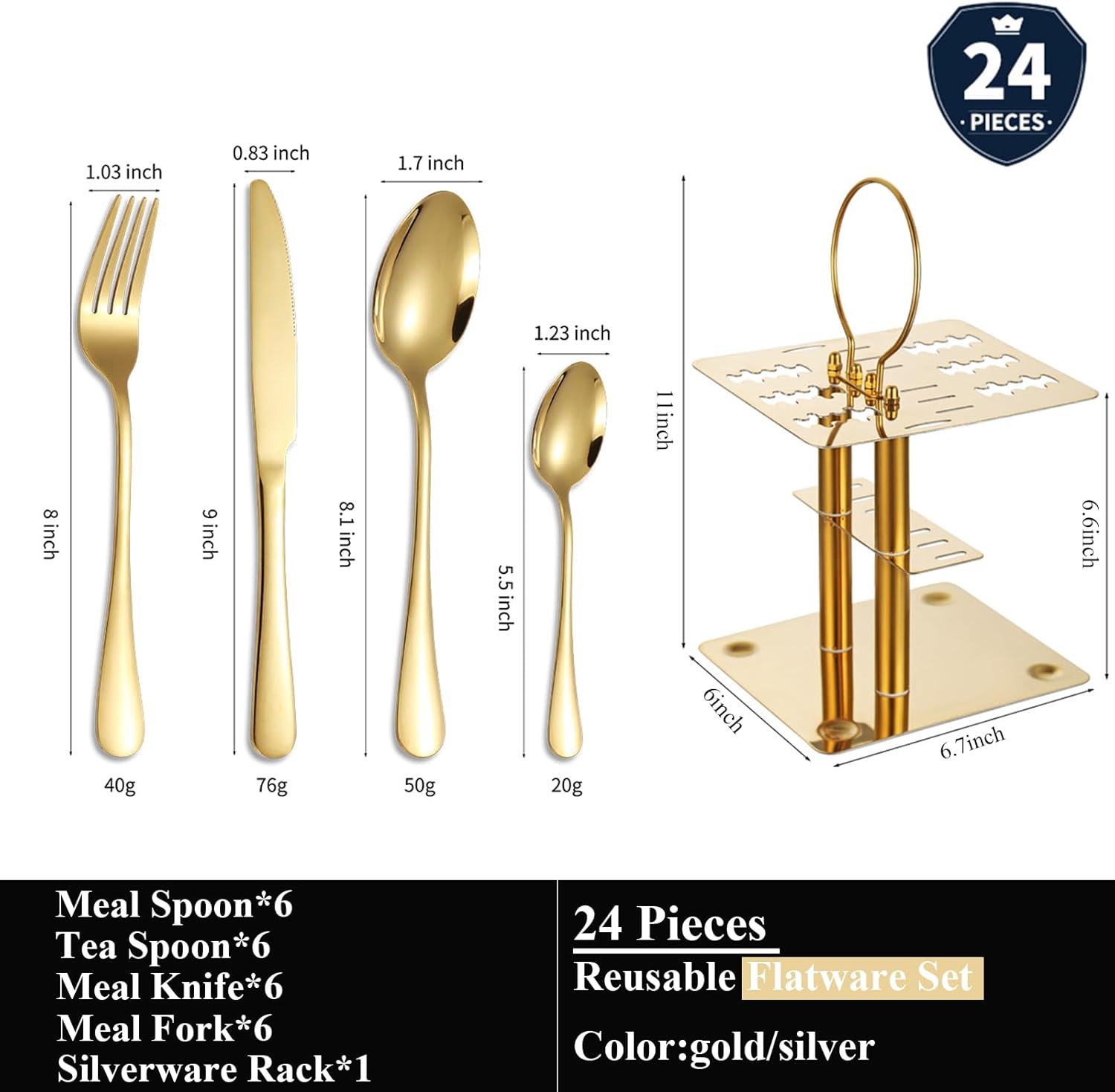 This tableware set is made of high-quality stainless steel to ensure safety and durability. They are rust-resistant, sturdy in construction, durable for daily use and dishwasher safe. With simple and elegant design, they are definitely the perfect flatware set for serving large families, entertaining guests or hosting parties, holiday meals, weddings and more. SPECIFICATIONS Material:stainless steel Colour:silver/gold Quantity:24 pcs Process: mirror polished/integrated molding Size of each set:8.9*6.1*11inch Weight of each set:4.0lb Packing Includes:dinner knives*6,dinner forks*6,dinner spoons*6,teaspoons*6,holder rack*1 NOTE Flatware Set Care Guide 1. Always remove any food remnants as soon as possible to avoid stubborn buildup or rust. 2. Please use a mild cleaner and warm water, and don't let the flatware set soak for long periods. 3. After cleaning, dry the cutlery set immediately with a soft cloth to prevent water spots. 4. The flatware set is dishwasher safe. CUSTOMER SERVICE If you have any questions before and after buying, please contact us at any time, we will reply to you within 24 hours and give you a satisfactory answer. Thanks for your support.