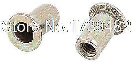Product Name | Rivet Nut Material | Zinc Plated,MetalType | Flat HeadColor | Brass ToneThread Diameter | 3mm/0.12"Sleeve Inner Diameter | 4mm/0.16"Sleeve Outer Diameter | 5mm/0.2"Cap Size | 7x1mm/0.3"x0.04"(D*T)Total Size | 7x10mm/0.3"x0.4"(Max.D*L)Package Content | 100(+/-2%)Pcsx Rivet NutsDescriptions: Flat head cap screws, Furniture accessories. Once installed, they are permanently attached to the mating material, allowing the associated nut to be removed in service without the risk of the fastener becoming dislodged. Item specifics:Is customized: YesModel number: /Type: Hexagon Nutssupplies: ELECTRICAL