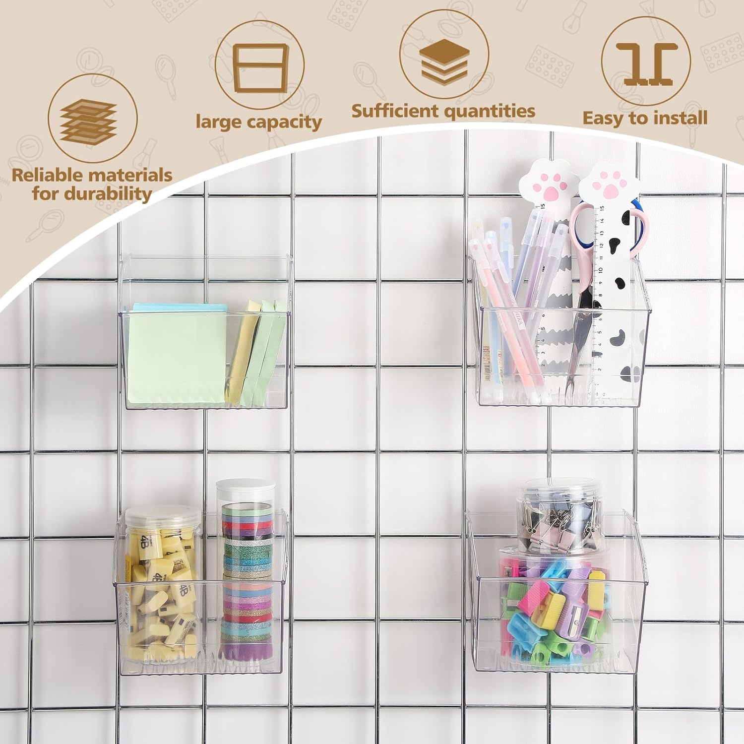 Features: Wall mounted design: These wall-mounted baskets are incredibly easy to hang and take down with hooks on the grid plate. Move and replace them any time by simply hanging at any suitable position. Streamlined organization: Keep your spaces tidy and organized without compromising on style with our transparent, wall-mounted baskets. Experience easier accessibility, proficient organization, and a tidier environment in one. Specifications: Material: plastic Color: clear Size: 4.92 x 5.12 x 3.74 inches/ 12.5 x 13 x 9.5 cm Package includes: 6 Pack Grid wall baskets Notes: Manual measurement, please allow slight errors on size. The color may exist a slight difference due to different screen displays.