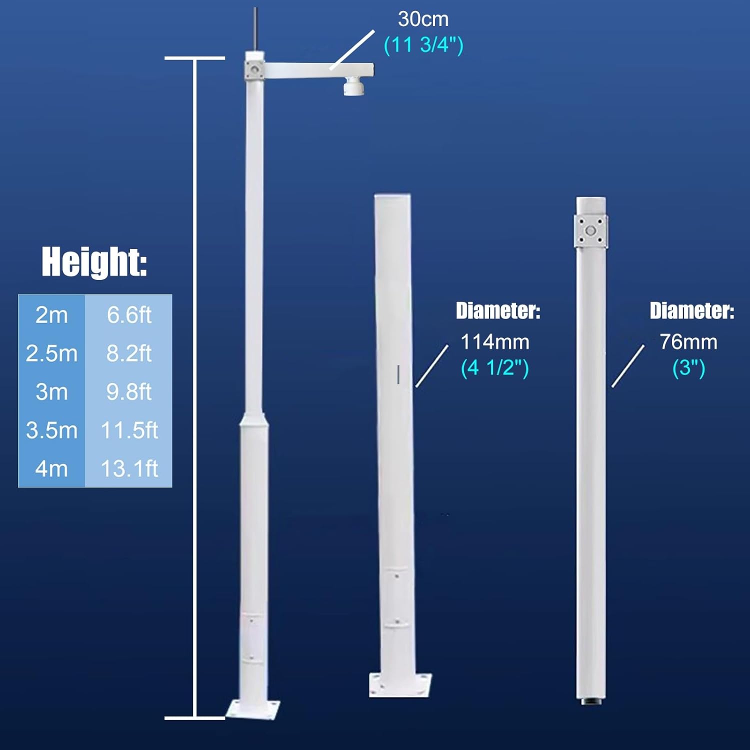 This versatile surveillance pole is engineered for exceptional stability and optimal camera positioning, ensuring dependable performance in various weather conditions. Whether monitoring a park, road, or public square, you can confidently install your security cameras to enhance safety and surveillance effectiveness. **Key Features:** - **Durable Construction:** Made from high-strength galvanized iron, this pole is designed to withstand harsh environmental conditions, making it a reliable choice for both residential and commercial applications. - **Easy Installation:** The sectional design allows for effortless transportation and straightforward setup. It's ideal for users who require quick deployment in diverse locations. - **Adaptable Design:** This pole accommodates various cross arms and brackets, allowing you to customize your setup to meet specific surveillance needs, whether for security cameras or other monitoring equipment. - **Aesthetic Appeal:** With its simple yet elegant design, this pole integrates seamlessly into outdoor environments without compromising functionality. **Specifications:** - **Height Options:** Available in 2m (6.6ft), 2.5m (8.2ft), 3m (9.8ft), 3.5m (11.5ft), and 4m (13.1ft) to cater to diverse surveillance requirements. - **Diameter:** Features options of 76mm (3") and 114mm (4 1/2") for enhanced stability. - **Cross Arm Length:** 30cm (11 3/4") to ensure optimal camera placement. **Note:** - Manual measurements may lead to slight variations. - Color discrepancies may occur due to different lighting during photography; please refer to the actual product for accurate representation. **Customer Support:** We are dedicated to providing assistance should you encounter any issues with our product. Your satisfaction is our priority, and we are here to help you achieve your surveillance goals.