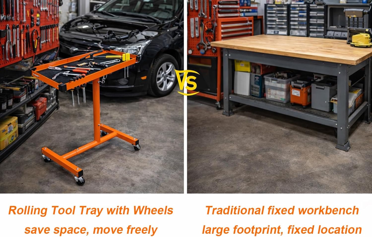 Orange Heavy-Duty Adjustable Work Table 4 Swivel Wheels 220 lb Capacity, Tear Down Tray 28.9" x 19.8" Moblie Portable Industrial Desk