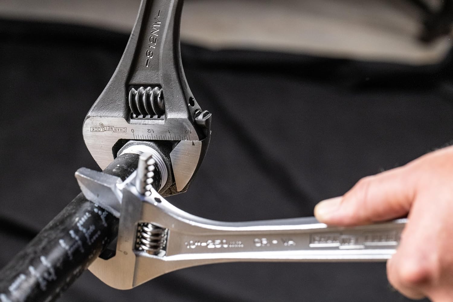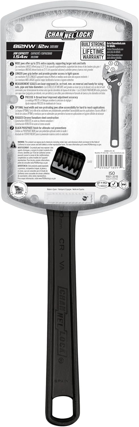 Product Description Adjustable Wrench, Jaw Capacity 1-1/2 In., Overall Length 12 In., Alloy Steel, Black Phosphate, Plain, Features 4-Thread Knurl, Standards ANSI, Meets/Exceeds ANSI From the Manufacturer The Channellock 812NW 12-Inch Adjustable Black Phosphate Coated Wrench has longer jaws that grip better, avoiding slippage or nut round off. Measurement scales (in. on front mm. on reverse) are handy for sizing nuts, pipe and tube diameters. Greater jaw capacity supports larger nuts and bolts. Thinner jaws for greater access in tight spaces. Precise jaw design grips tight the first time, every time. Four thread knurl and non-protruding jaws provide greater capacity; minimal head width improves performance in confined spaces. Made in Spain to the highest quality standards of Channellock, Inc.