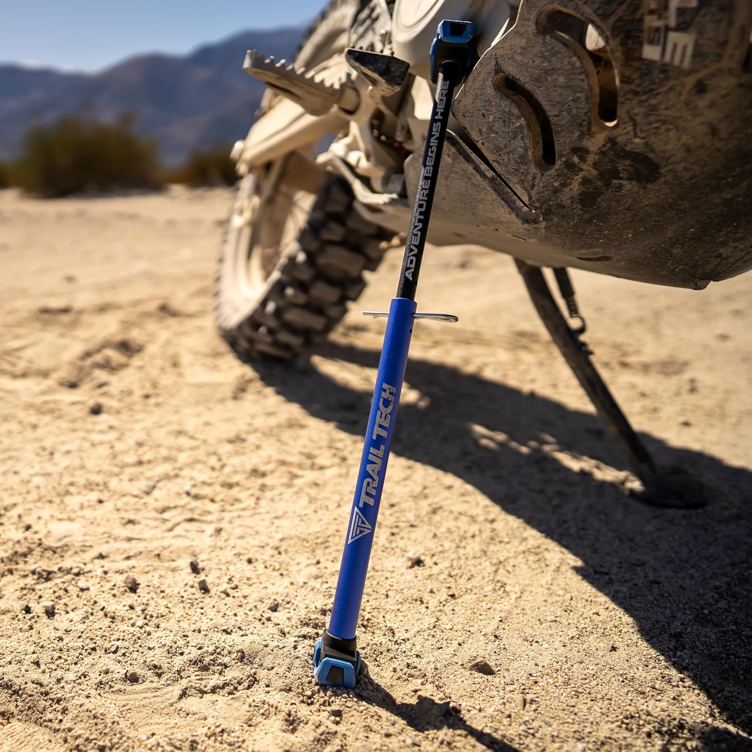 The Trail Stand is a lightweight, collapsible support tool for off-road and adventure motorcycle maintenance. It offers a secure third point of contact, allowing riders to lift their bikes on uneven terrain. The stand collapses to a compact 10 inches for easy storage and extends to 19 inches, accommodating a wide range of motorcycles. It features a lightweight, collapsible design that stows neatly in the included mesh zipper carry bag, making it convenient for any adventure. A standout feature is the machined aluminum feet with molded silicone pads, ensuring maximum traction on loose surfaces. The feet pivot to maintain flat contact with the ground, enhancing stability even on uneven surfaces. The included Velcro strap also secures the brake lever during repairs, preventing unwanted movement.