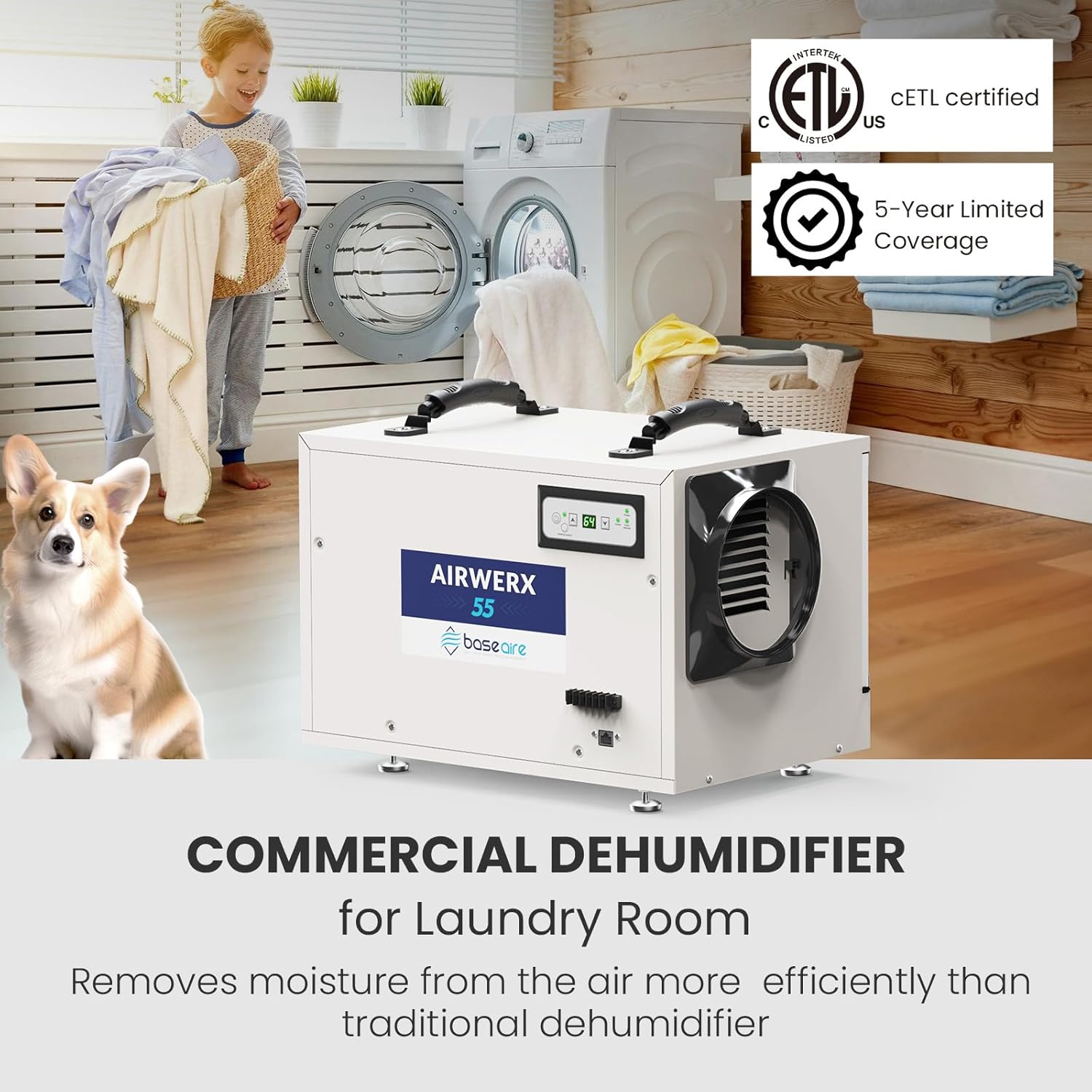 BaseAire 113 Pints Crawl Space Dehumidifier for Commercial with Hanging Kit and Remote Controller