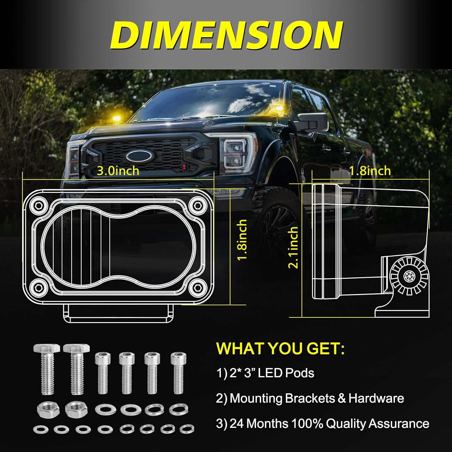 PACKAGE INCLUDE: 2* 3 Inch Amber LED Pods 1* Wire Kit w/ Handlebar Switch & Fuse Adjustable Mounting Brackets Screw Set