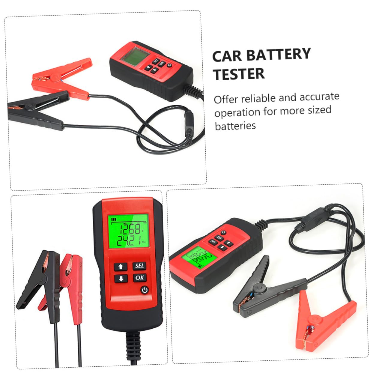 Package List 1 x tester 1 x manual Characteristics Working temperature: -20°C~60°C Auto Supplies. Voltage range: 7~15V Car Testing Tool. - Scope of application:12 storage battery exclusive use,measurable battery range: 5-9995 Battery Analyzer for Car. Display: LCD screen Auto Battery Tester. Application range: 12V battery Automotive Battery Tester. - LCD display: Clear display, , , including battery life Car Battery Testing Equipment. -Color: Red Car Battery Analyzer. -Material: ABS, copper, rubber, electronics Car Battery Testing Tool. Storage temperature: -20°C~60°C Car Supply. - : ABS material, more durable, firmly made Battery Tester for Car. -Size: About 13.00X6.70X2.90cm/5.11X2.63X1.14in Car Battery Tester. Specification: Auto Battery Analyzer value range: 5~9995. - Continuous test with battery power, not damage to battery, and protection device Car Battery Checker. - Offer reliable and accurate operation for more sized batteries.Goods DescriptionCar Battery Analyzer Using advanced testing technology, to ensure stable and safe communication all throughout the test.Automotive Battery Tester Easy to use with backlight LCD display to get battery status, check battery health