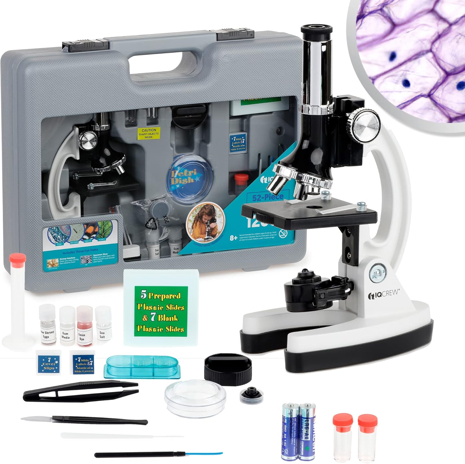 THE ULTIMATE MICROSCOPE W/ DELUXE INSECT EXPLORATION KIT FOR KIDSReady to use right out of the box. A great starter kit with 49 accessories, hard sided plastic ABS case, a 1000 Facts About Insects book and 30 pieces insect prepared slides. Create your own discoveries with reusable blank slides and covers, tweezers, eye dropper, Petri dish and more...PORTABLE ...... EASY TO CARRY CASEWith 49 accessories included and an easy to carry case kids can conduct safe and fun experiments and activities all on their own.GREAT FOR GIFTINGProviding endless hours of fun, this kit is the perfect gift for boys and girls of all ages. It’s the perfect tool for your budding scientist.COMPLETE BRINE SHRIMP EXPERIMENTObserve the life cycle of tiny ocean creatures and gain hands-on experience in the scientific method, visual analysis, note-taking and more.AMSCOPE-KIDS microscopes are made of the finest materials and with the best optics to ensure that you get precise answers and solutions to all your endeavors. This science microscopy kit includes a great beginner level biological microscope equipped with advanced features and all the necessities of accessories, a 1000 Facts About Insects by National Geographic Kids and 30 pieces insect prepared slides. The microscope features six magnifications of 120X, 240X, 300X, 480X, 600X and 1200X, a single coaxial coarse focus knob, a specimen stage with two built-in stage clips, and a nature light and/or LED illumination system. It can be illuminated with either nature light through a mirror or by the built-in LED light that provides direct control of light. The microscope has a durable metal arm that makes it a great value. The kit comes with sample slides, cover slips, plastic tweezers, a plastic scalpel, specimen vials, adjustable lenses, collecting vials, plus a sturdy hard case for easy storage and travel. This set is great for beginning scientists.The Deluxe Insect Exploration Kit includes 30 beautifully prepared glass insect specimen slides in a compact wooden case and 5 full-color cards with fun facts and diagrams about 10 of the most popular insects in the world around us. From butterflies and mosquitos to dragonflies and honeybees - these cards will provide your child with lots of interesting facts about the insects and animals that surround us. The 96 page full-color book - 1000's of Facts About Insects that comes with the kit will make sure your child will have hours of fun learning about insects while also improving his or her reading skills.Features:120X, 240X, 300X, 480X, 600X and 1200X six magnifications beginner microscope with metal constructionBuilt-in light for direct illumination.Reflecting mirror for natural illuminationBattery compartment for 2 AA-size.Built-in rotating color filter wheel.Specimen stage with stage clips.Includes: plastic scalpel, plastic spatula, plastic tweezers.Specifications :Magnifications: 120X, 240X, 300X, 480X, 600X and 1200X.Body Type: Durable Metal ArmIllumination: built-in LED light and reflecting mirror.Eyepiece: holder type single.Stage: 70 x 65mm.Slide Holder: dual spring clips.Accessory Set: 1 shrimp hatchery, 1 specimen slicer, 5 prepared slides, 7 blank slides, 1 petri dish, 7 slide cover, 1 plastic tweezer, 1 graduated cylinder, 1 spare bulb, 7 slide covers, 7 slide labels, 1 plastic scalpel, 1 plastic spatula, 1 needle, 1 plastic stirring rod, 1 eosin, 1 gum media in a bottle, 1 sea salt, 1 brine shrimp eggs, 2 collecting vials, 2 AA batteries.Packing List :Beginner microscopeAccessory setHard ABS case1000 Facts About Insects Book by National Geographic Kids30 PC Glass Prepared Insect Slides in a Wooden BoxFor ages 8+