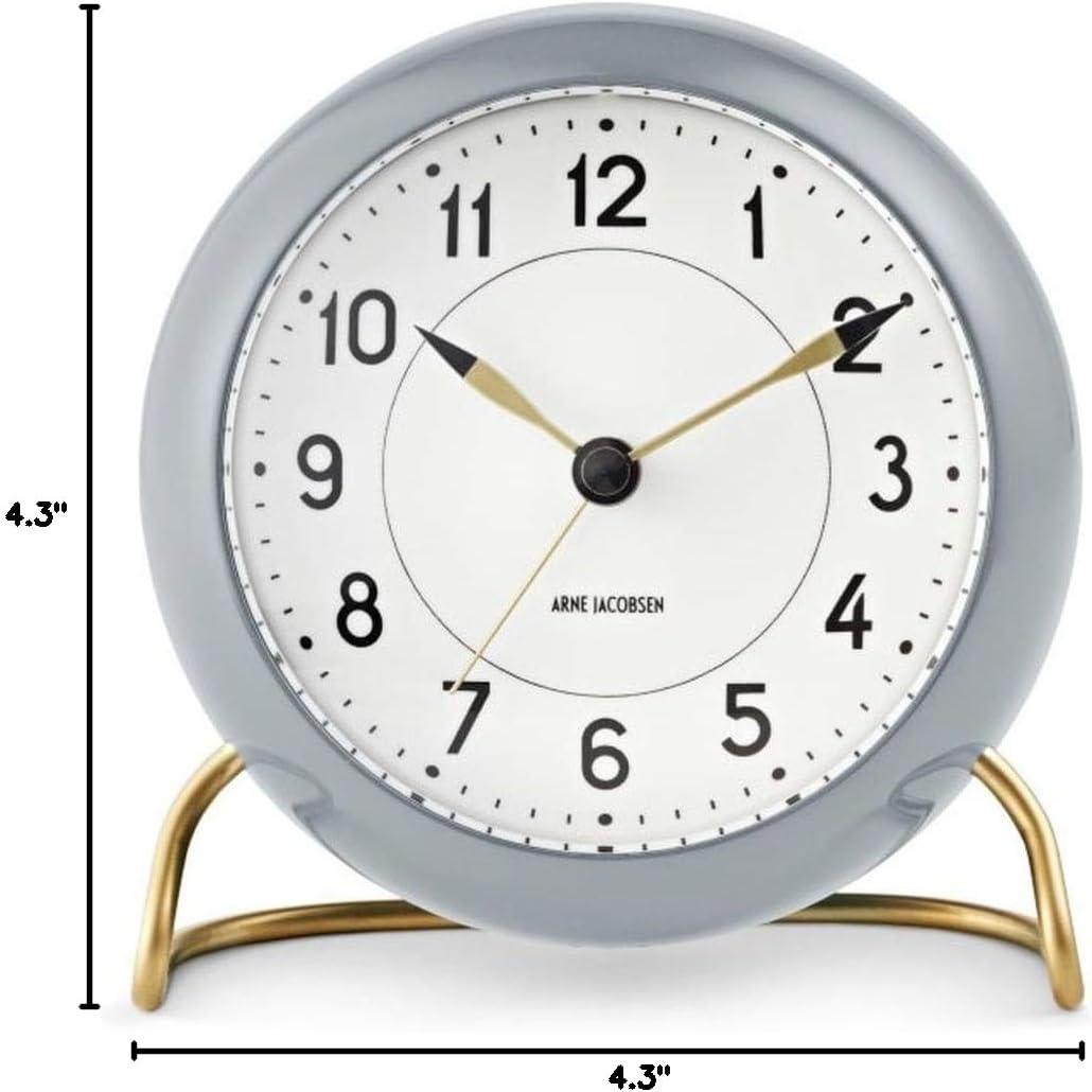 This table clock by Arne Jacobsen has a diameter of 11 cm. The clock shows hours and minutes. The watch has a decorative metal base with high stability.