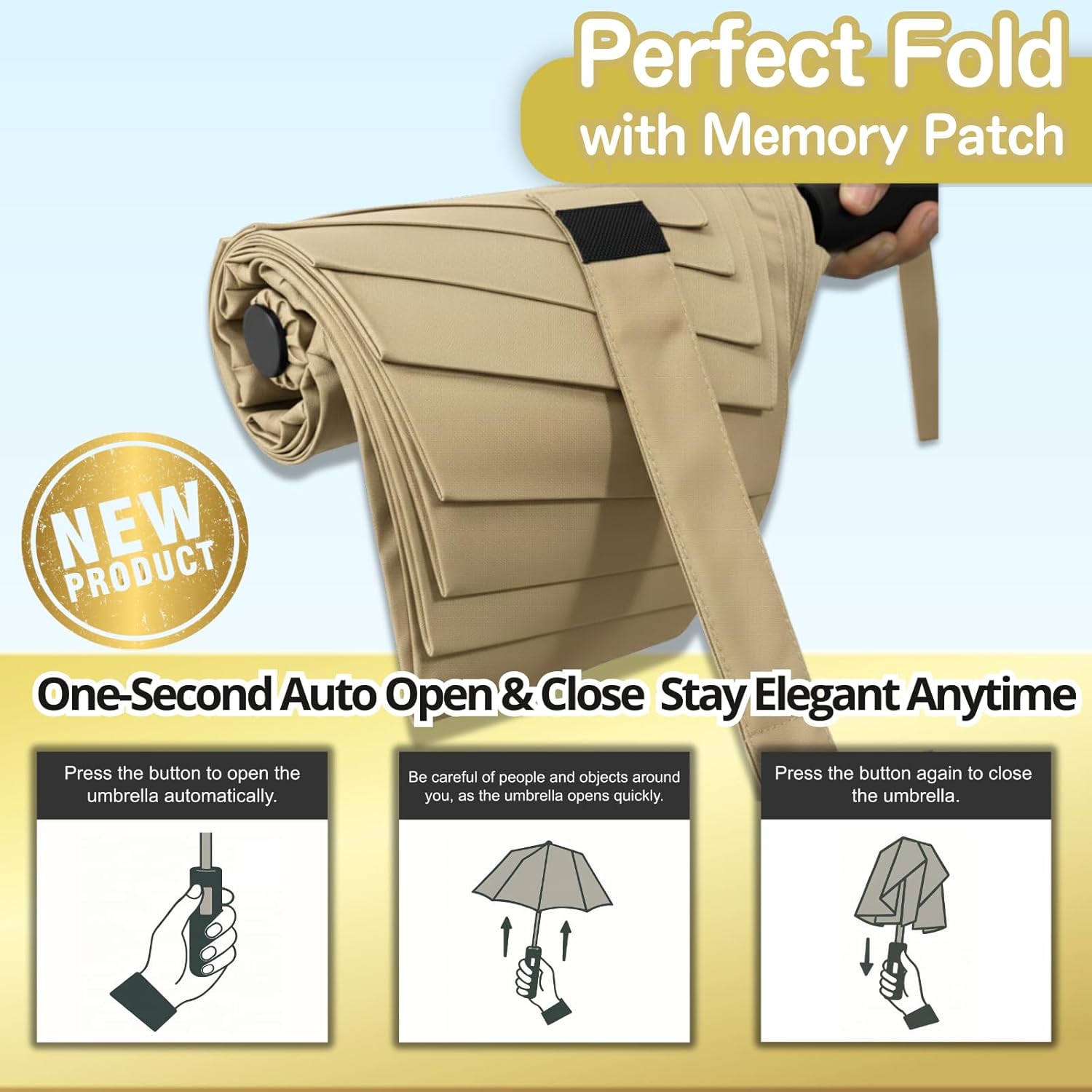 • Easy to Fold & Store: Folding an umbrella has never been easier. Our automatic folding rain umbrella features a specially designed memory patch that helps guide the folds, letting you quickly tuck it away without the struggle. Perfect for your travel umbrella collection or for daily use on the go.