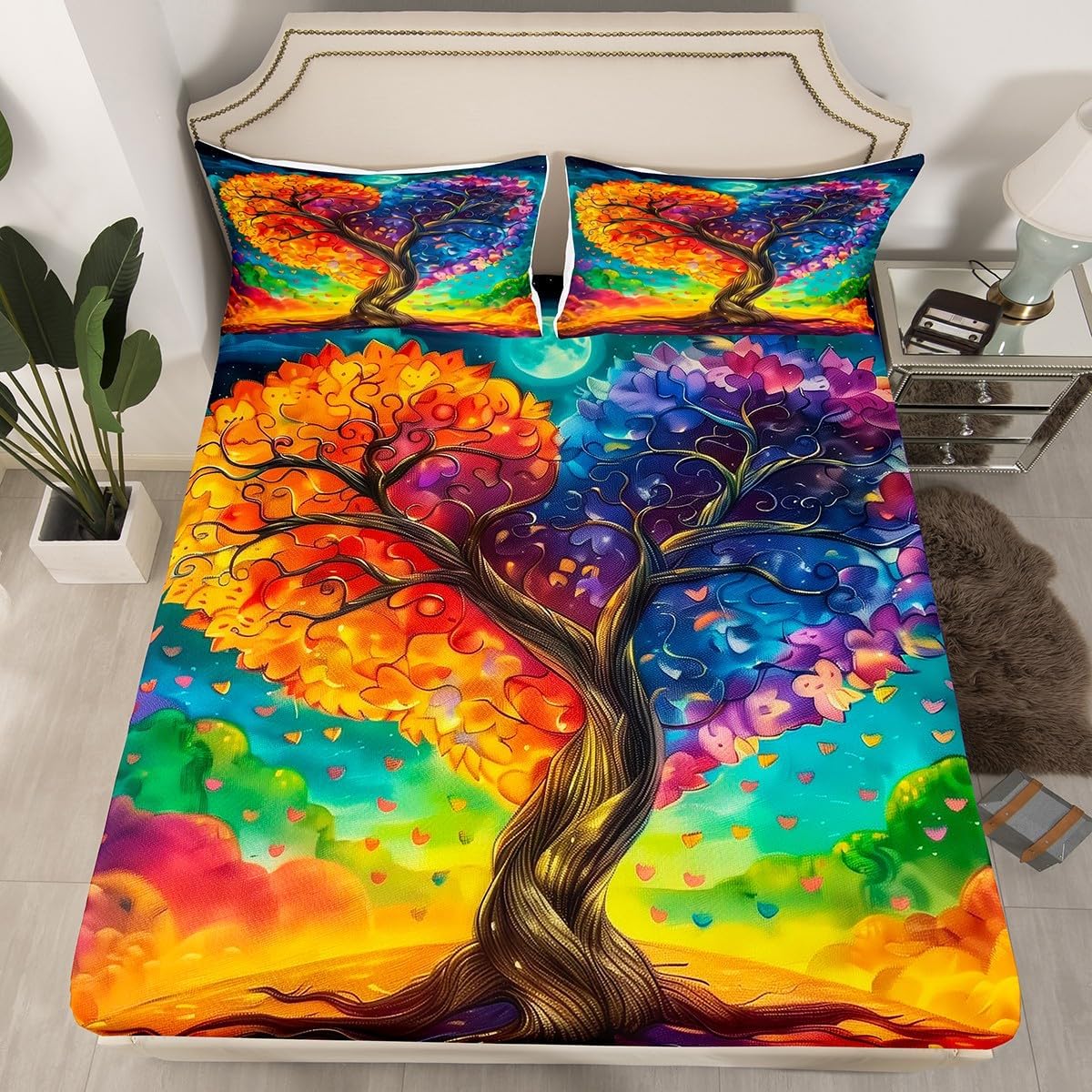 Bohemian Theme Retro Tree Fitted Sheet,Full Size Modern Simple Style Collections,Tree of Life Bedding Deep Pocket for Children Teens Young with 2 Pillowcases(No Flat Sheet)