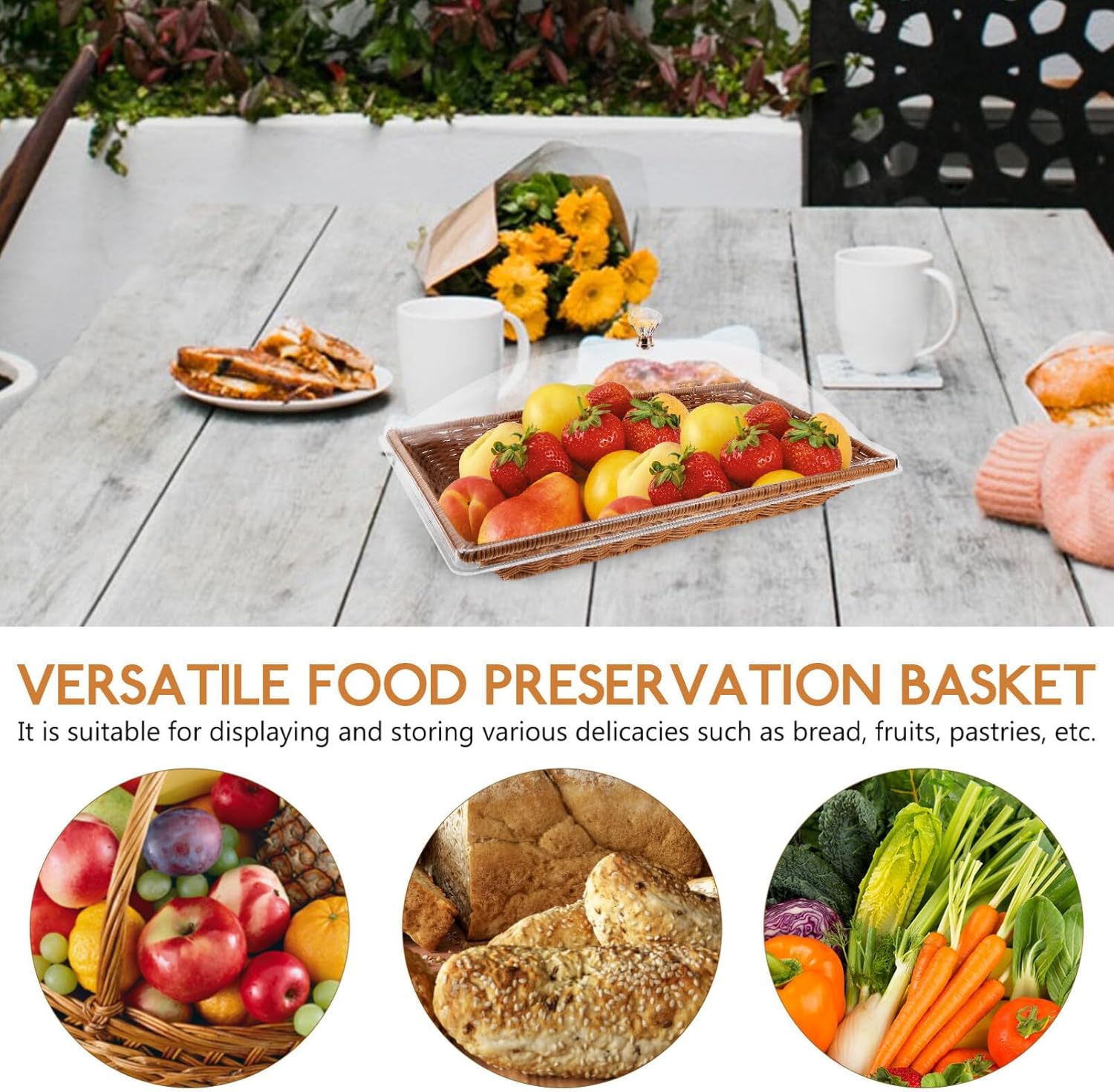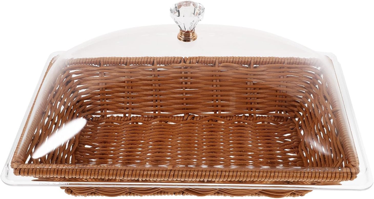 DescriptionThis bread basket with transparent lid is a versatile food preservation basket. It is suitable for displaying and storing various delicacies such as bread, fruits, pastries, etc. It is made of materials, lightweight, smooth. The transparent cover is made of acrylic, which can protect items.Features-Material:PP, acrylic -Size: 41.60X26.00X18.50CM-This basket is made of materials, bread basket provides a healthy storage solution for food. -This basket is lightweight, smooth, transparent cover is made of sturdy acrylic, for protecting. -This bread basket is suitable for homes, restaurants, kitchens, offices, fruit shops, picnics, parties, etc.-The fashionable and minimalist design of this fruit basket can protect, easy to clean with a damp cloth.-The woven storage basket is suitable for home, bakery, cake shop, food store, office, shopping mall, etc.Package Including1 x basket 1 x lid