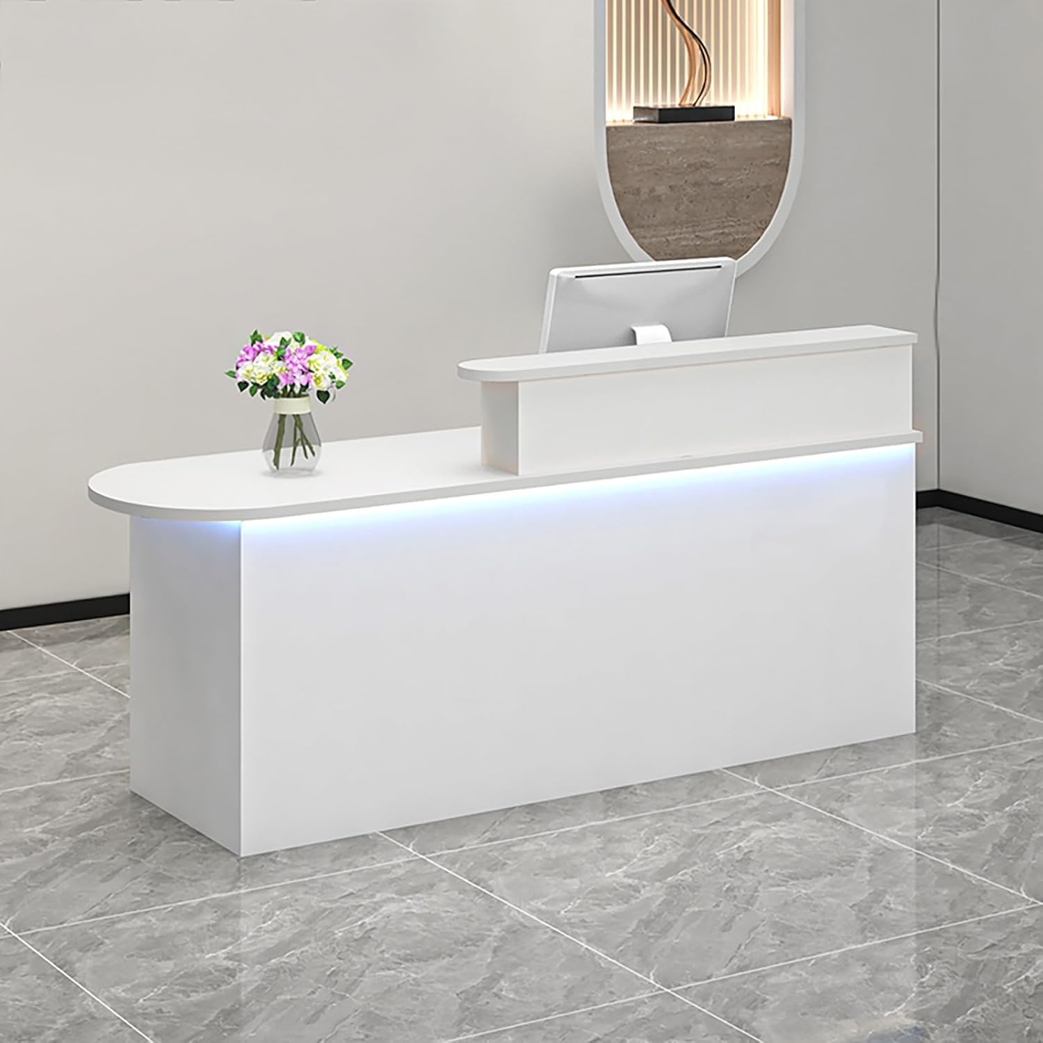 Reception Counter Table Front Desk Checkout CounterCrafted from sturdy MDF and reinforced metal framing, this front desk reception counter offers long-lasting practicality while maintaining an elegant, professional appearance. The smooth, scratch-resistant surface is easy to clean and withstands daily wear and tear, ensuring your workspace stays polished and presentable.Keep essentials secure and within reach with the lockable drawer, ideal for storing cash, documents, or office supplies. The convenient sliding keyboard tray saves space and promotes ergonomic comfort, reducing strain during long work hours. The spacious desktop provides ample room for computers, paperwork, or customer transactions, helping you maintain a clutter-free environment.The integrated LED light adds a welcoming glow to your lobby or beauty salon, improving visibility for staff and clients. Whether used for task lighting or ambiance, this feature enhances the professionalism of your space.With a compact yet efficient design, this reception counter table fits seamlessly in small to medium-sized areas while offering maximum functionality. Its versatile style complements various settings, including offices, clinics, retail stores, and salons, making it a smart investment for any business.Slide-Out Drawerwith Lock for Higher Security Provide concealed storage space for your personal and business items.Its metal slides ensure smooth opening and closingSpecificationsMaterial: Engineered WoodAll necessary hardware and clear instructions are included for quick and straightforward assembly. The sturdy construction ensures stability, while the sleek finish adds a touch of sophistication to your workspace.Notice:1. Note: Due to the particularity of the furniture, there will be slight errors in the finished product, which is normal. The data is for reference only and must be based on the actual product. We hope for your