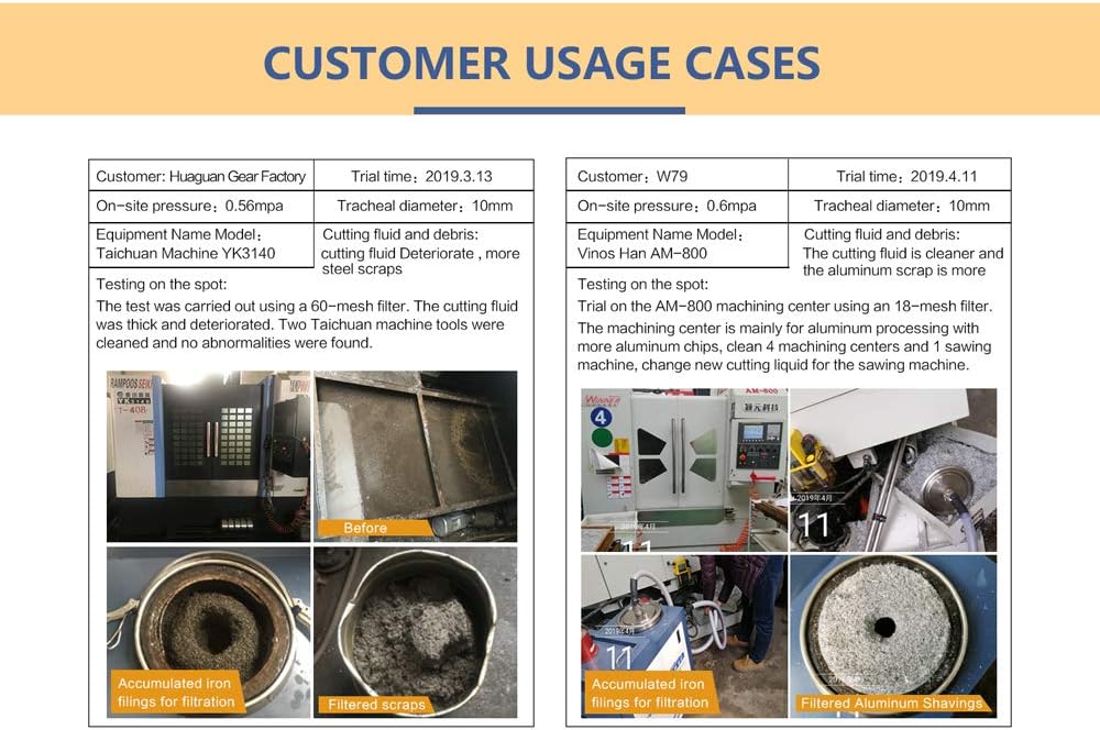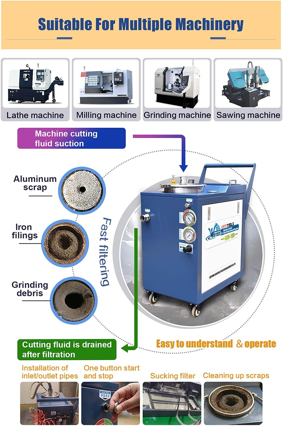 Features:Efficiently remove chip, sludge and other impurities in the machine tool tankEasy to move, one machine for multiple machine tools. Applicable to lathe, milling machine, sawing machine,etc100L/min flow; quickly removeLarge capacity; 9L filter drumNo need to stop the machine tool and no plug-in(Pneumatic)Value broughtReduce tool loss, ensure machining accuracy, increase productivity. Extend the service life of cutting fluid and reduce production cost. Improve the workshop environment and ensure the health of workers. Environment friendly. Saving resources and reducing emissions.