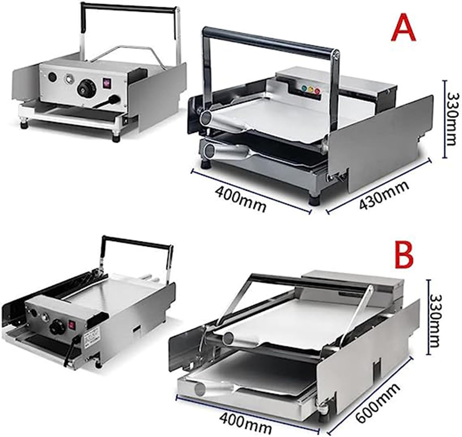 A:Small:Material: food grade stainless steelPacking size: 49*45* 34.5cmGross weight: about 9.8kgProduct size: 43*40*33cmTemperature range: 50-300℃Time: 0 -3 minutesPower: 750WOutput: 12 at a time, 6 eachInclude:Burger machine, non-stick spatula, stainless steel pot cover, power supply, manual