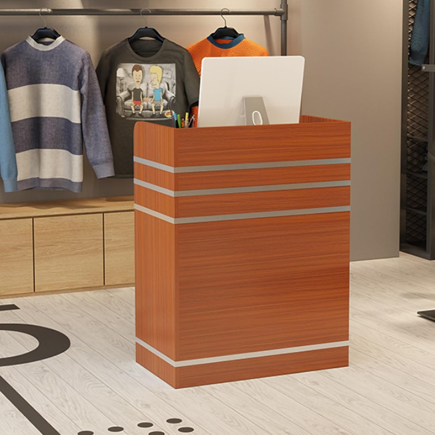 Standing Retail Checkout Counter Table:This Front Counter Desk with Lockable Drawers is available in a variety of colors and finishes, allowing you to choose the ones that best match your brand image. The built-in lockable drawers of the Modern Retail Counter provide a safe space for storing valuable items. The reserved cable pass-through holes of the Small Modern Office Reception Desk enable easy installation of cables and wires, keeping your work space clean and organized. The spacious countertop of the Minimalist Modern Clothing Store Greeting Counter offers ample space for various activities. Whether constantly opening and closing the drawers during a busy day at the cash register or handling various items on the countertop, the design of this Small Reception Desk For Small Spaces can maintain its integrity in the long term. Product name: Creative clothing milk tea shop bar cashier table beauty salon small shop reception counter with lock drawer reserved threading hole Size: 60*42*92cm/23.6*16.5*36.2in Material: particle board/melamine board Color: warm white, black walnut, light walnut, teak color Product installation: assembly Applicable scenarios: office, beauty salon, supermarket, hotel, bank, etc. Notes: Due to the particularity of furniture, the finished product may have an error of 1-3cm, which is normal. Please refer to the actual product. Due to shooting lighting, display, mobile phone, angle and everyone's understanding of color, it is normal for the color of the picture to be slightly different from the actual product.