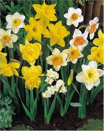 From the Manufacturer Add brilliant color to your garden with these 250 mixed Narcissus daffodil bulbs. Known for their golden-yellow, white, and sunburst-orange colors, these flowers make cheerful bouquets. They are also durable, dependable, and one of the easiest bulbs to cultivate, perennializing for many years. They grow to 18 to 24 inches tall and bloom in mid-spring. Produced in England and Holland, the bulbs measure 10 to 12 cm each. There's no need to worry about animal pests as squirrels, moles, and deer will not eat or disturb these hardy flowers. Four Steps Step 1 Step 2 Step 3 Step 4 to Spring To get your bulbs snugly bedded in the ground for the long winter, just follow the four illustrated planting steps below.Step 1: Dig holes to the depth indicated for your bulb variety Step 2: Plant the bulb with pointed end up Step 3: Cover the bulb with soil Step 4: Water thoroughly and keep moist during dry periods Daffodil Tips Generally, daffodils should be planted September through December in areas that receive full sun to light shade. Plant them 4 to 6 inches deep with 4- to 6-inch spacing between bulbs. For best results, fertilize daffodils lightly before they bloom, and let foliage wither after blooming. Plant them 2 to 3 inches deep with 3- to 4-inch spacing between bulbs.