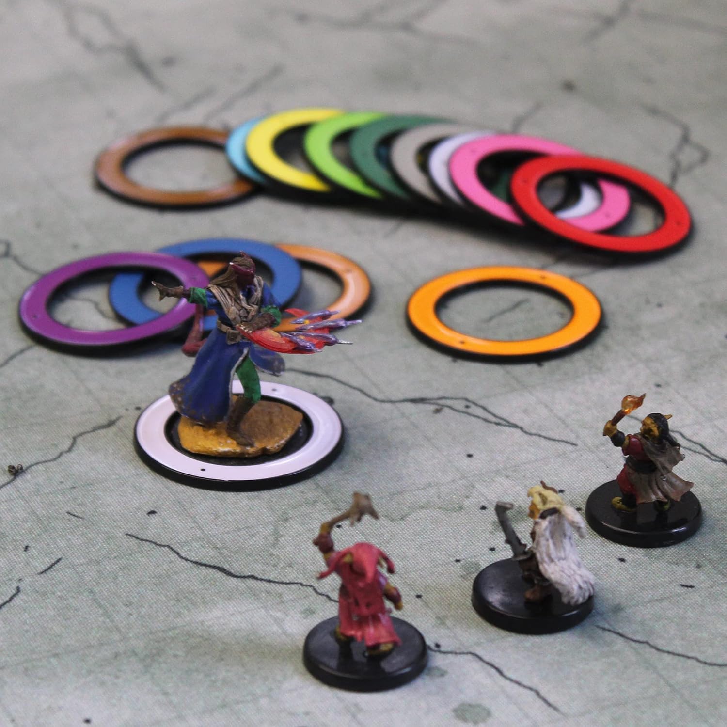 We've created condition trackers in the form of rings that you can use to mark what conditions and spells are affecting your characters or monsters. Place the miniatures inside the precisely machined inset (made to fit standard 1" circular miniature bases), or hang the rings on your larger miniatures. The fourteen ring set makes tracking status effects during combat simple and elegant, and eliminates having to use plastic bands or bottle cap rings. Each of the fourteen rings is a different color and text free, allowing you to choose which status each one represents. Set Includes 14 Rings (1 each of dark blue, turquoise, powder blue, red, orange, tan, brown, grey, lavender, yellow, pink, purple, light green, and dark green)