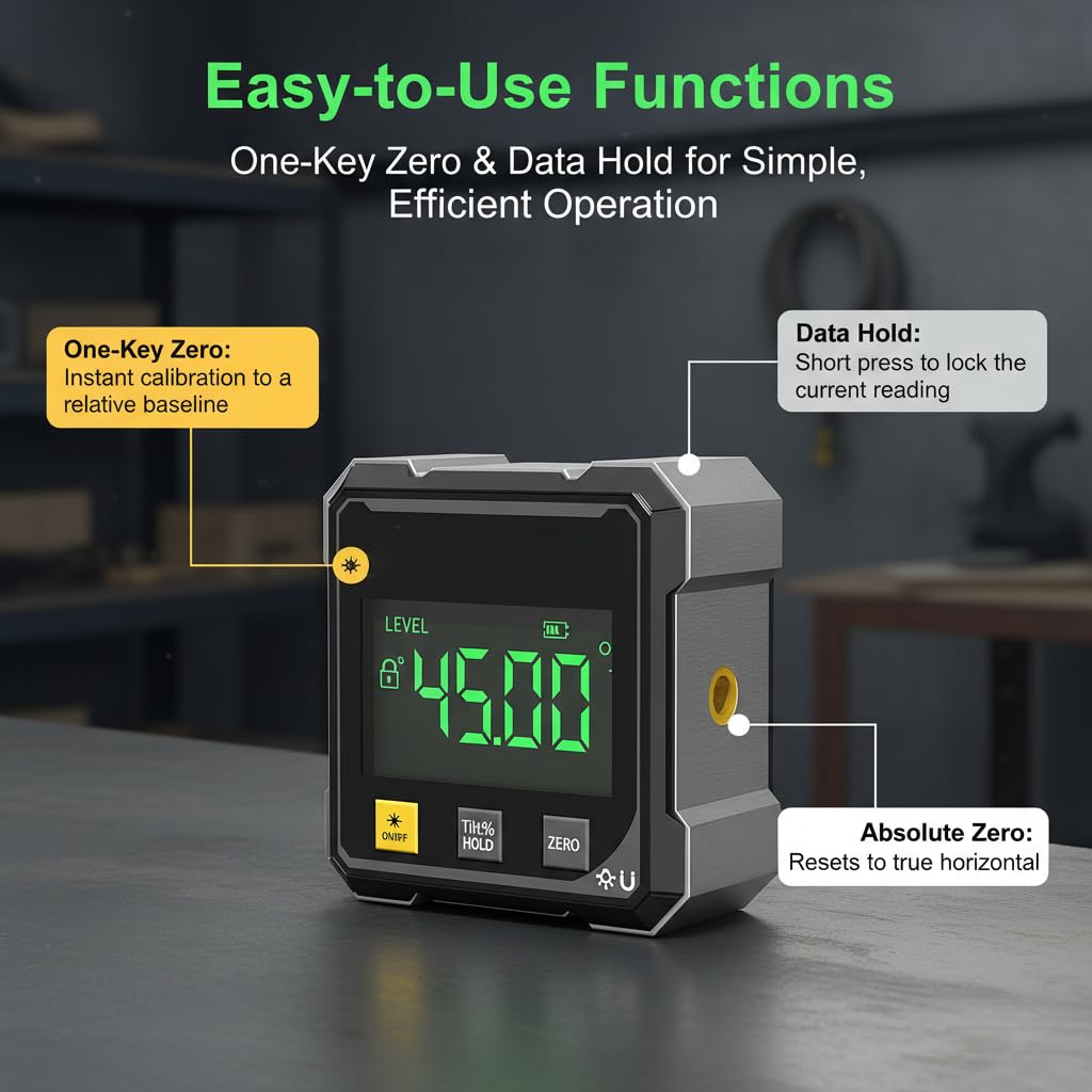 All-directional strong magnetic adsorption: Powerful magnets are embedded on all four sides of the body, which can firmly attach to metal surfaces, allowing you to measure with ease while freeing your hands. 360° all-round measurement: Supports 4×90° non-stop measurement, taking into account both absolute horizontal and angle measurements, and is suitable for various scenarios. Laser-assisted positioning: Equipped with laser emission function, the measurement baseline is visualized, resulting in more accurate positioning and eliminating reading errors. High-precision measurement performance: The resolution is 0.05°, the tolerance is only ±0.1°, the data accuracy is high, and it meets the requirements of professional measurement. Convenient operation feature: Equipped with a one-click zeroing and data holding (HOLD) function. A short press can lock the reading, making the operation simple and efficient. Durable and shock-resistant material: The product is equipped with an aluminum alloy casing, combined with an impact-resistant hard shell design, which is wear-resistant, shock-resistant and has a long service life.