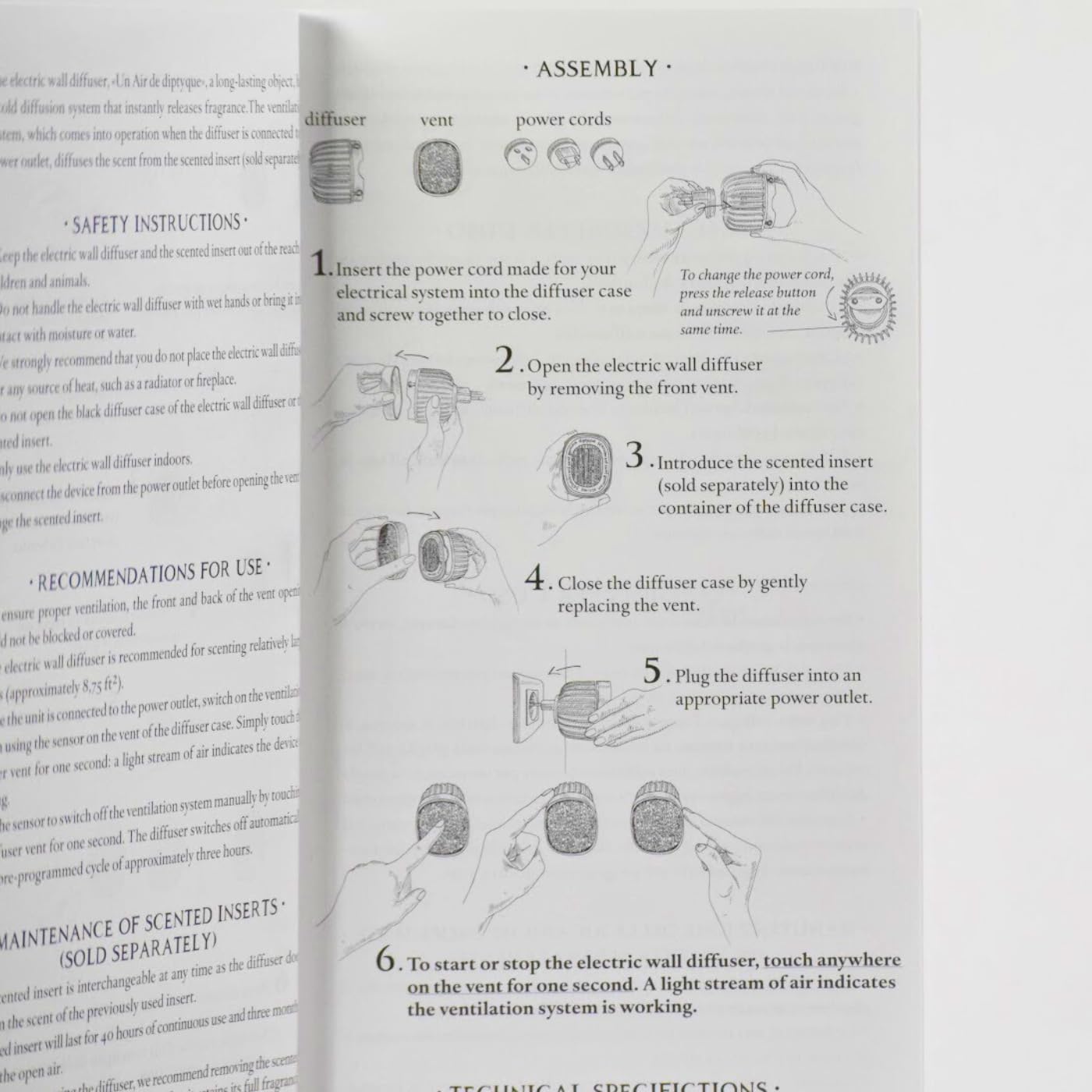 DDIPTYQUE Electric Wall Diffuser Diptyque Electric Wall Diffuser is an exceptional object. Sophisticated in both its design and technique, the wall diffuser uses contemporary, portable technology to diffuse nine iconic Diptyque scents. Activate with a simple touch anywhere on the vent to switch the device on and off. Electric Wall Diffuser is sold without cartridge.