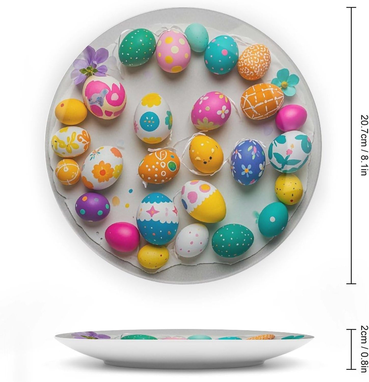 Are you looking for a good gift? Are you looking for a good furniture decoration? Then choose us! Why choose our bone china decorative plates? Our Easter Eggs printed bone china plate set includes a decorative plate + bottom frame + hook + adhesive sticker. It can be placed anywhere you want to decorate, elegant and beautiful. This bone china decorative plate is available in 6.1 Inch, 7.7 Inch, 8.7 Inch, 10.1 Inch four sizes for your choice. 6 inch - Diameter 15.4 cm /6.1 in, Thickness 1.7 cm/0.7 in. 7 inch - Diameter 18 cm/7.7 in, Thickness 2 cm/0.8 in. 8 inch - Diameter 20.7 cm/8.7 in, Thickness 2 cm/0.8 in. 10 inch - Diameter 25.7 cm/10.1 in, Thickness 2.7 cm/1.1 in. This bone china decorative panel with a display stand can be placed in a three-dimensional manner, can be placed in a porcelain cabinet, on a shelf or side table,or hung on a wall, giving it a very elegant and artistic appearance. Its sophisticated design will complement any interior decorating style, becoming a focal point wherever it is placed. This decorative plate adopts a adhesive stickers design, which is very convenient even if you want to disassemble it in the future. It's easy to clean and just wipe with a dry cloth when needed. Every plate will be carefully packed, so it will arrive very safely. If there is damage, you can contact our to help you.