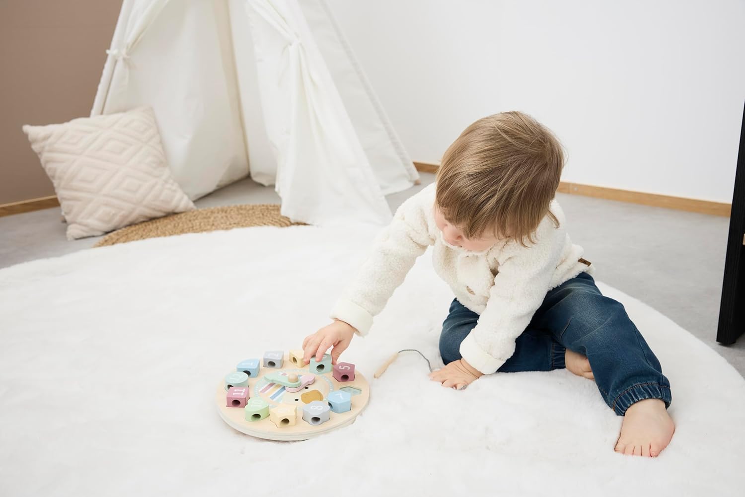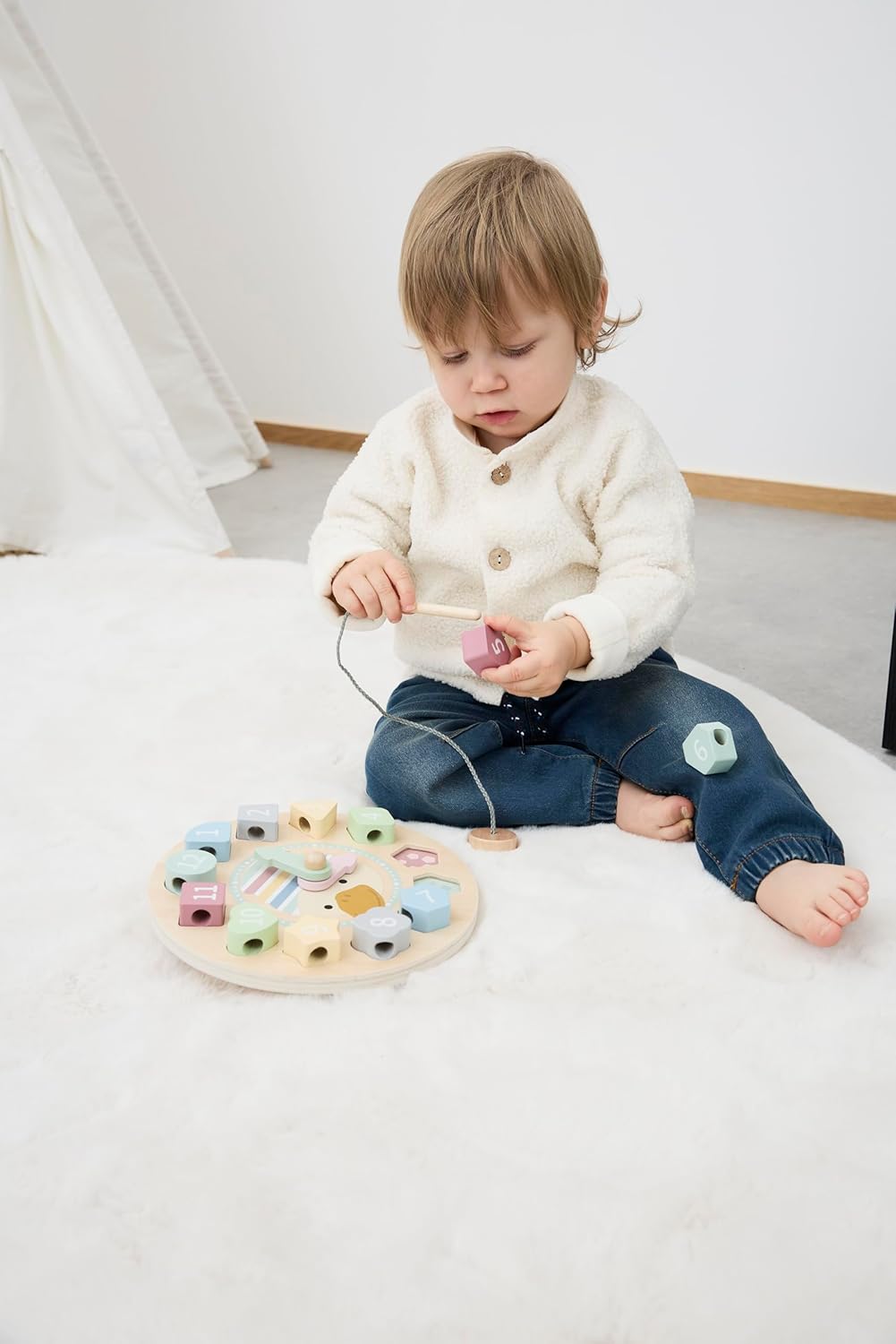 With the ENTE Edda Learning Clock, children aged 24 months and above can learn not just time-telling, but also shapes, colors, and numbers. Its movable pointers, colorful building blocks, and friendly design stimulate imagination and enhance fine motor skills, making it an educational companion.