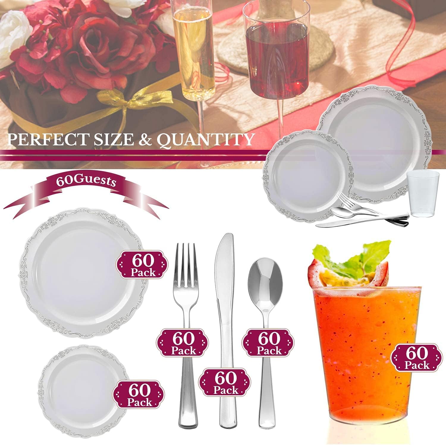 Elegant Plastic Plates, Disposable Dinnerware Sets, Plastic Dinner Plates, Disposable Plates for Party, Disposable Plastic Plates, Party Plates (Clear with Silver, Wedding Value Set (60 Guests))