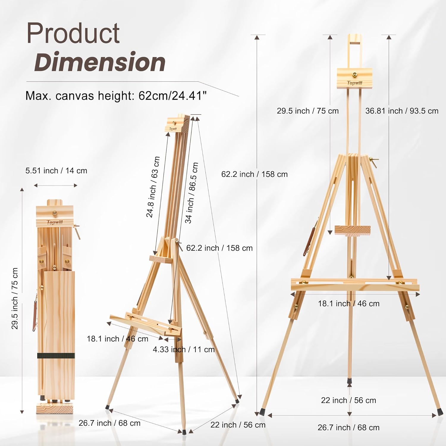 【Your All-in-One Easel: Create Anywhere, Anytime】 Built with Amercican Pine Wood and metal fittings, this easel supports 24.4" canvases and fits oil, acrylic & watercolor works. It adjusts to 62.2" height and vertical-horizontal angles, with a removable 18.1"×3.54" tray for tools. This portable A-frame easel is built for artists on the go—whether you’re sketching by the beach, painting in class, or refining works in your studio, it’s your lightweight, sturdy creative companion.