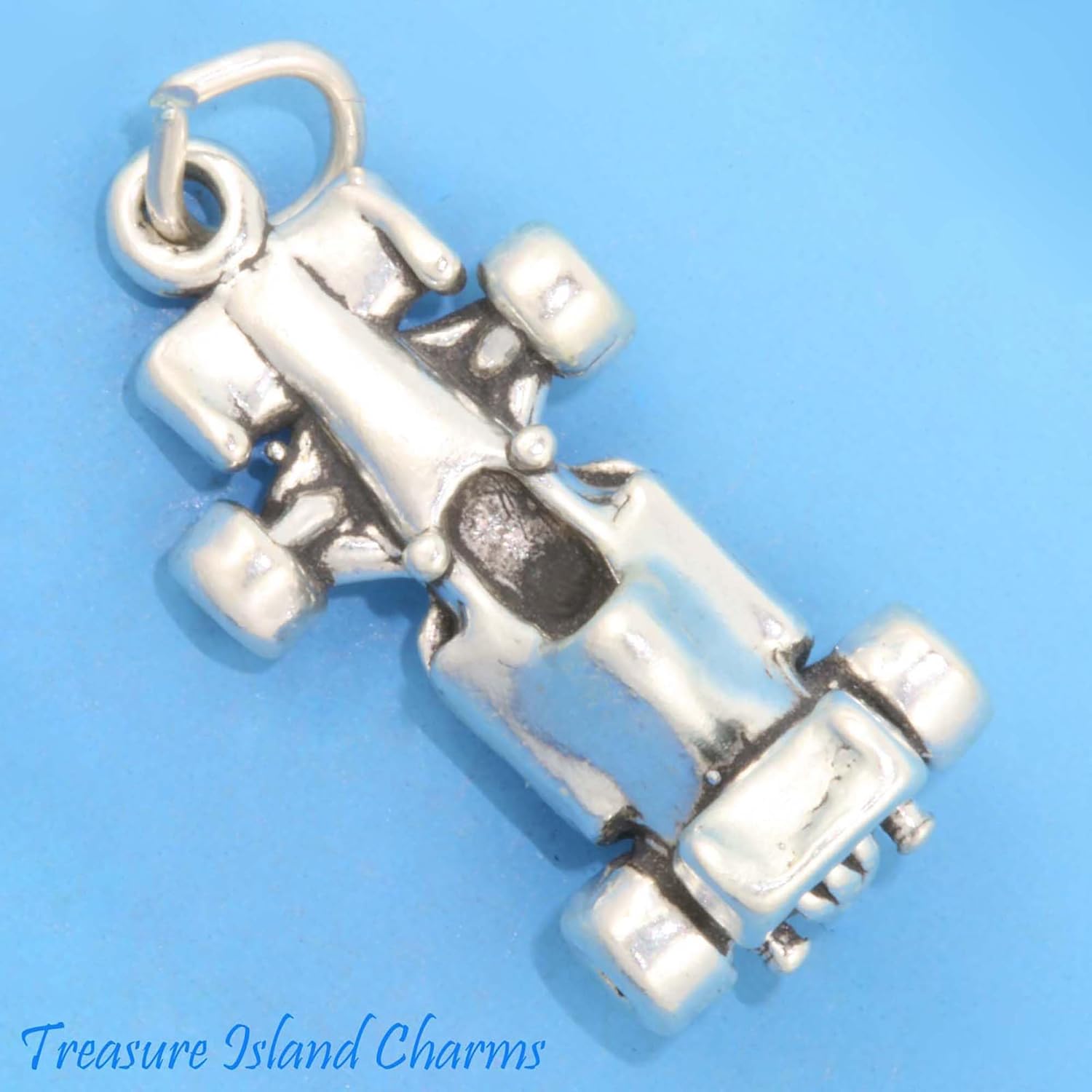 F1 race car 3D .925 solid sterling silver charm or pendant. The charm is hallmarked, comes with a 6mm sterling silver keychain/split ring, and can fit a traditional charm bracelet or a chain necklace.