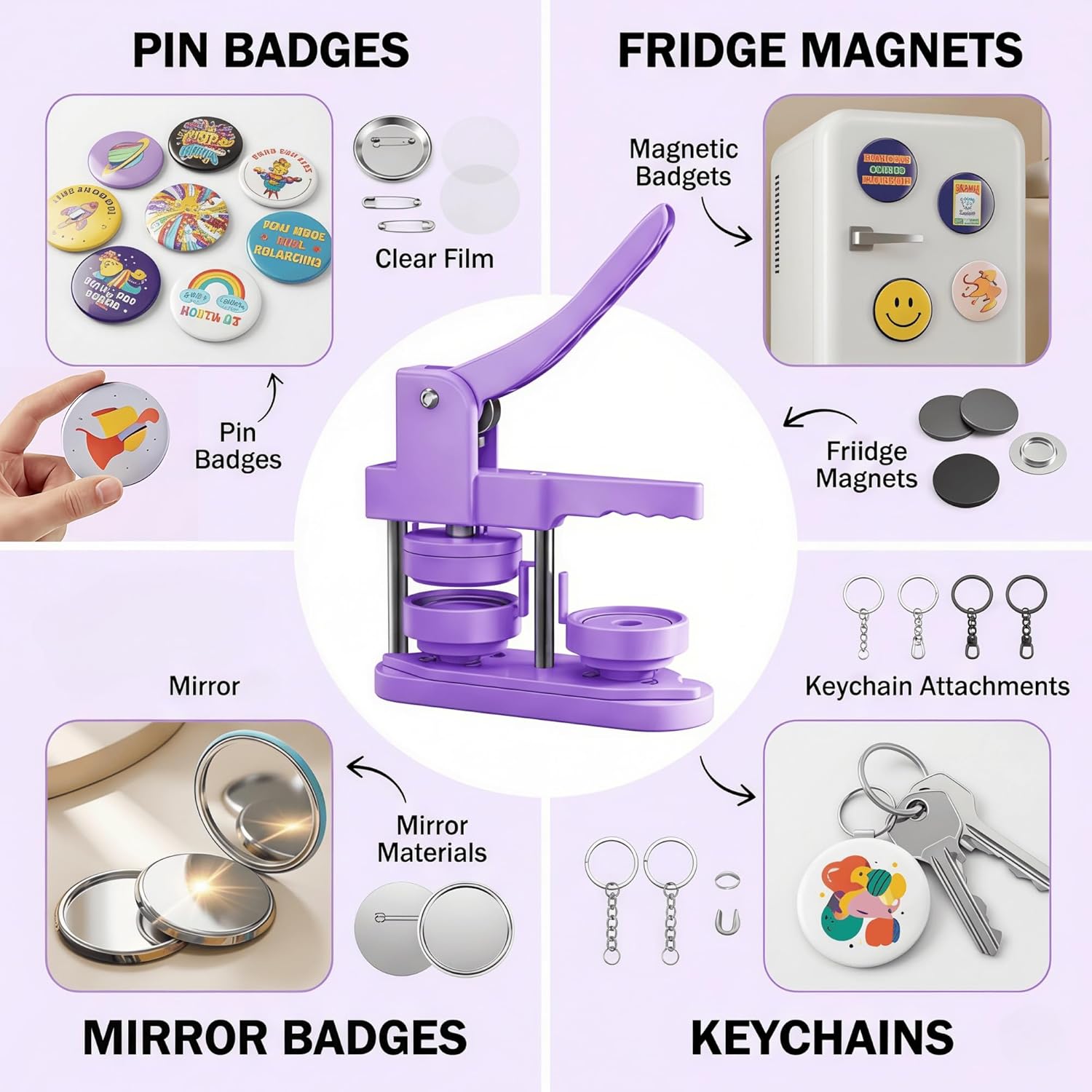 | Included Components | 58mm (2.25 inch) badge maker, 100pcs button parts, 58mm (2.25 inch) circle cutter, 100pcs 58mm (2.25 inch) pictures, 110 printed badge designs, instruction booklet |