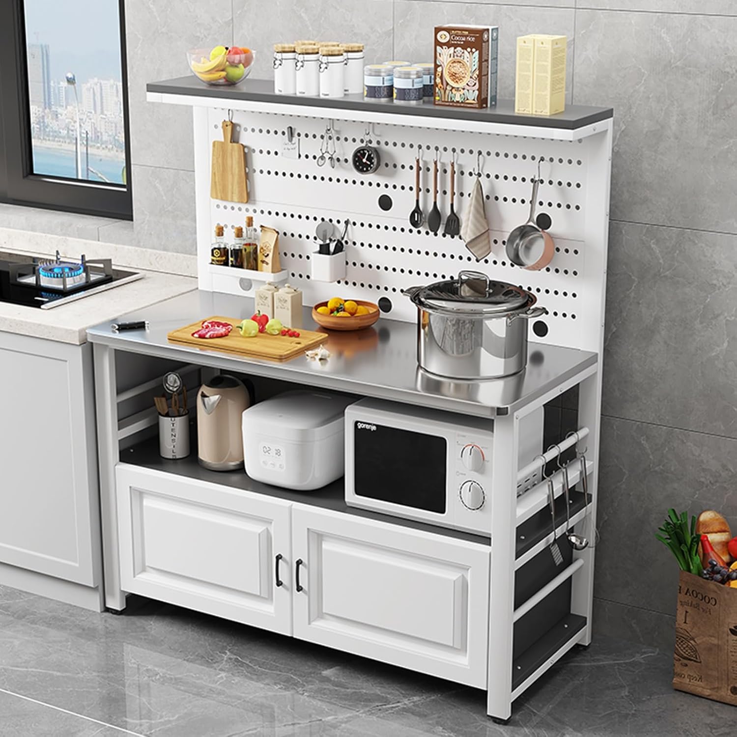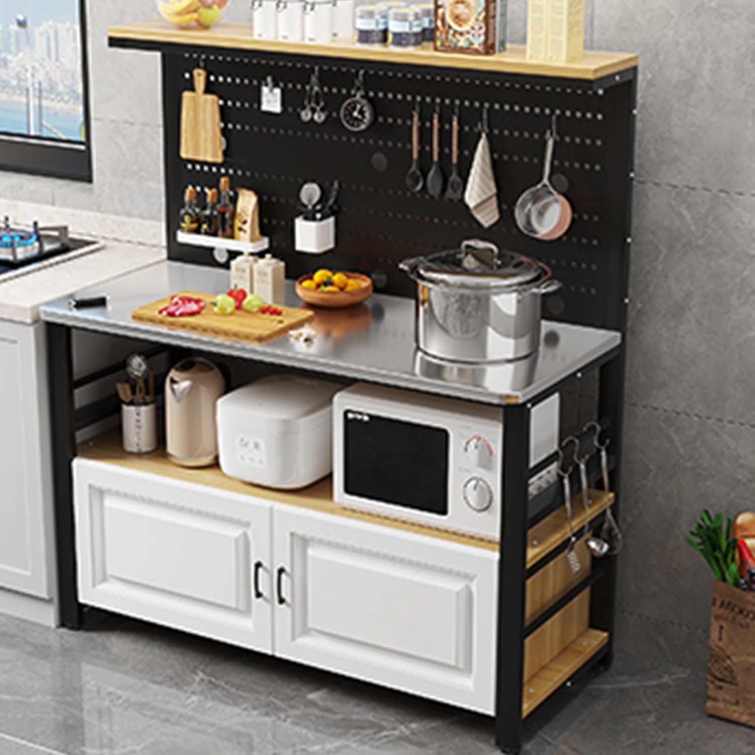 kitchen storage rack:Kitchen Prep Table, Storage Shelf with Lockers As a cupboard, it provides enough space for microwave, dishes and other kitchen appliances, great for extra space to free up your counter. Multifunctional Pegboard Features of the multifunctional pegboard, you can hold a variety of tools, make full use of space, and is convenient and fast. Stainless Steel Made of the thicker stainless steel, it can be used for long time. Rounded Edge The equipment stand is designed for safe with rounded edge. Convenient Hanging Hook With 4 accessory hanging hooks on the side, it is convenient and accessible way to hang your pots, pans, utensils, oven mitts, and more. roduct information Material: Stainless Steel+ Metal frame + Plate Product Dimensions Length: 58cm/23 inches,68cm/27 inches,78cm/31 inches,88cm/35 inches, 98cm/39 inches, 108cm/43 inches , 118cm/46 inches,128cm/50 inches,138cm/54 inches, Width: 40cm/16 inches, 50cm/20 inches Height: 140CM/55 inches Color: Black frame+gray , White frame+gray , Black frame+wood , White frame+wood , Black frame+white , White frame+white , Black frame+teak , White frame+teak , Black frame+black , White frame+black Assembly Required: Yes Our multifunctional storage cabinet will be an great choice for your home or office.