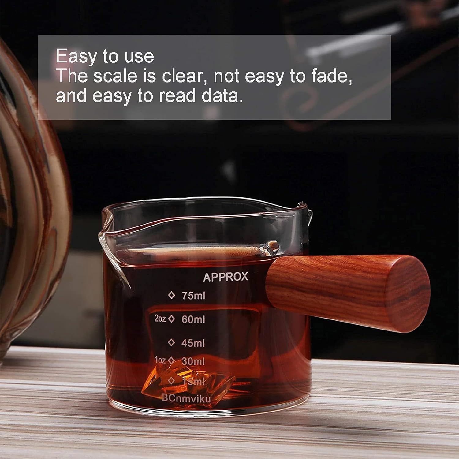 Feature:1. Durable, made of highquality thicken glass, good heat resistance and long service life.2. Easy to use, the cup with clear scale, not easy to fade, easy to read data.3. The design is , and the round wooden handle effectively fire and heat insulation, making it more comfortable to use.4. Doublemouth design glass, Vshaped nozzle, heatresistant thickening, explosionproof.5. It has a wide range of applications, suitable for lding coffee, milk, tea, etc.Specification:Item Type: Measuring CupMaterial: High Borosilicate Glass + Composite WoodWeight: Approx. 156g / 5.5ozProduct Size: Approx. 5.5x6cm / 2.2x2.4inCup Inner Diameter: Approx. 6cm / 2.4inOuter Diameter of Cup Mouth: Approx. 8cm / 3.1inLength of Wooden Handle: Approx. 4.5cm / 1.8inCapacity: 75mlPackage List:1 x Measuring CupNote:1. Please allow 12cm error due to manual measurement. Thanks for your understanding.2. Monitors are not calibrated same, item color displayed in ptos may be swing slightly different from the real object. Please take the real one as standard.