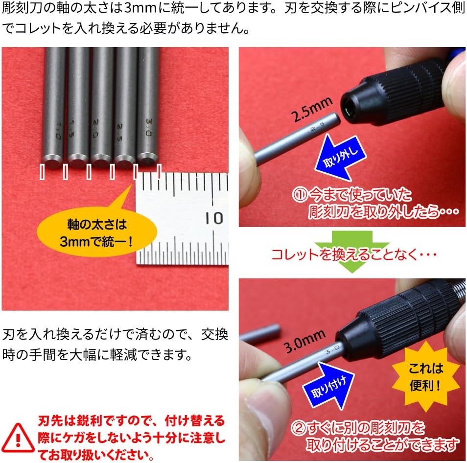 Round blade chisels can be equipped with pin vise! It can carve plastic eraser, wood, plastic, putty, resin and even seal carving stone, too! You can improve quality and work efficiency by using different width blades in each occasion. The body of chisel's diameter is same and easy to change. Good compliment to GodHand pin vise series!