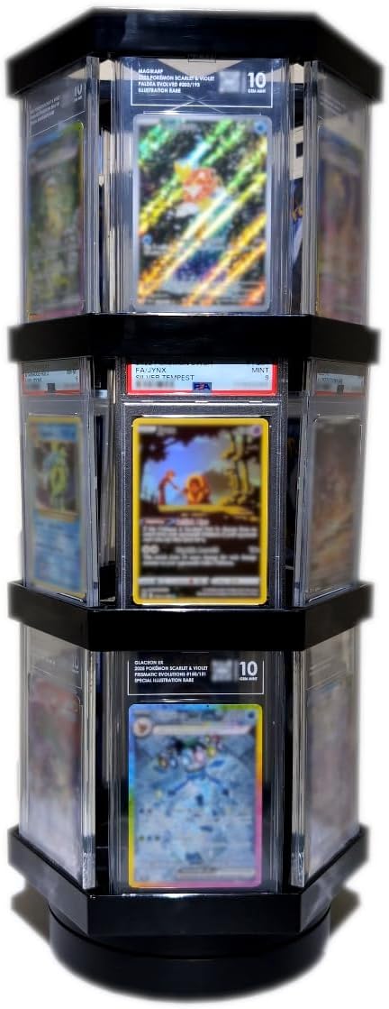 Showcase your collection in style with this rotating slab display stand, designed for both versatility and presentation. Powered by USB-C (wall plug or portable battery) or AAA batteries (not included), it offers flexible power options to suit any setup. With a universal fit for PSA, BGS, TAG, and CGC slabs, it’s perfect for showcasing your graded trading card slabs. The sturdy, balanced base prevents tipping and keeps your slabs secure, while the quiet motor ensures smooth, noise-free rotation - ideal for home displays, conventions, or retail environments. The stand features adjustable rotation speed and customizable height, with a default configuration of three tiers holding up to 18 slabs. Its 360° rotation lets your collection shine from every angle. Built with a modular, tool-free assembly, this display stand sets up in minutes and allows easy layer adjustments to fit your display needs. Whether for card shows, live streams, display shelves, or personal collections, this rotating stand is a sleek and functional way to elevate your showcase. Includes: 4 layer connectors, 1 rotating stand, and 1 USB-C cord. Cards and slabs not included.