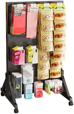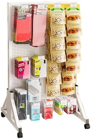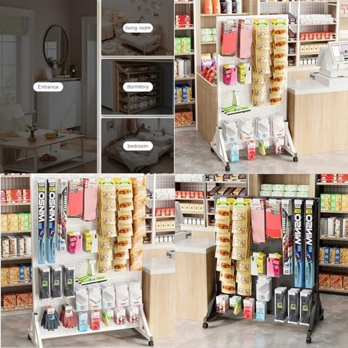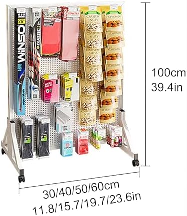 Freestanding Desk Storage Shelf: Description Steel pegboard organizer is a practical choice for you to store small tools, parts, sporting goods, kitchen utensil, office supplies, snack, jewelry, handicrafts and mini plants. Features: Standing peg boards, triangular stable base + universal caster, easy to move. 6mm/0.24in holes diameter and 16mm/0.63in holes spacing for most hooks, hanging boards, and hanging boxes. Metal steel pegboard, stable and durable, strong load-bearing capacity. Adapt to the scene: supermarket, retail, boutique, clothing store, shopping mall, home, hall, bedroom, entryway, cloakroom, office, dormitory, balcony, hotel, study, laundry, cloakroom, supermarket, retail, boutique, doorway Basic Information: Name: Pegboard, Display Stand Material: metal - cold rolled steel 8 Sizes (lengthxheight): 40x60cm/15.7x23.6in; 100x30cm/39.4x11.8in; 100x40cm/39.4x15.7in; 100x50cm/39.4x19.7in; 100x60cm/39.4x23.6in; 120x40cm/47.2x15.7in; 120x50cm/47.2x19.7in; 120x60cm/47.2x23.6in Hole diameter: 6mm/0.24in Holes spacing: 16mm/0.63in Color: white, black Package Include: Metal Pegboard with Base x1 Casters x4 Metal Hooks x2
