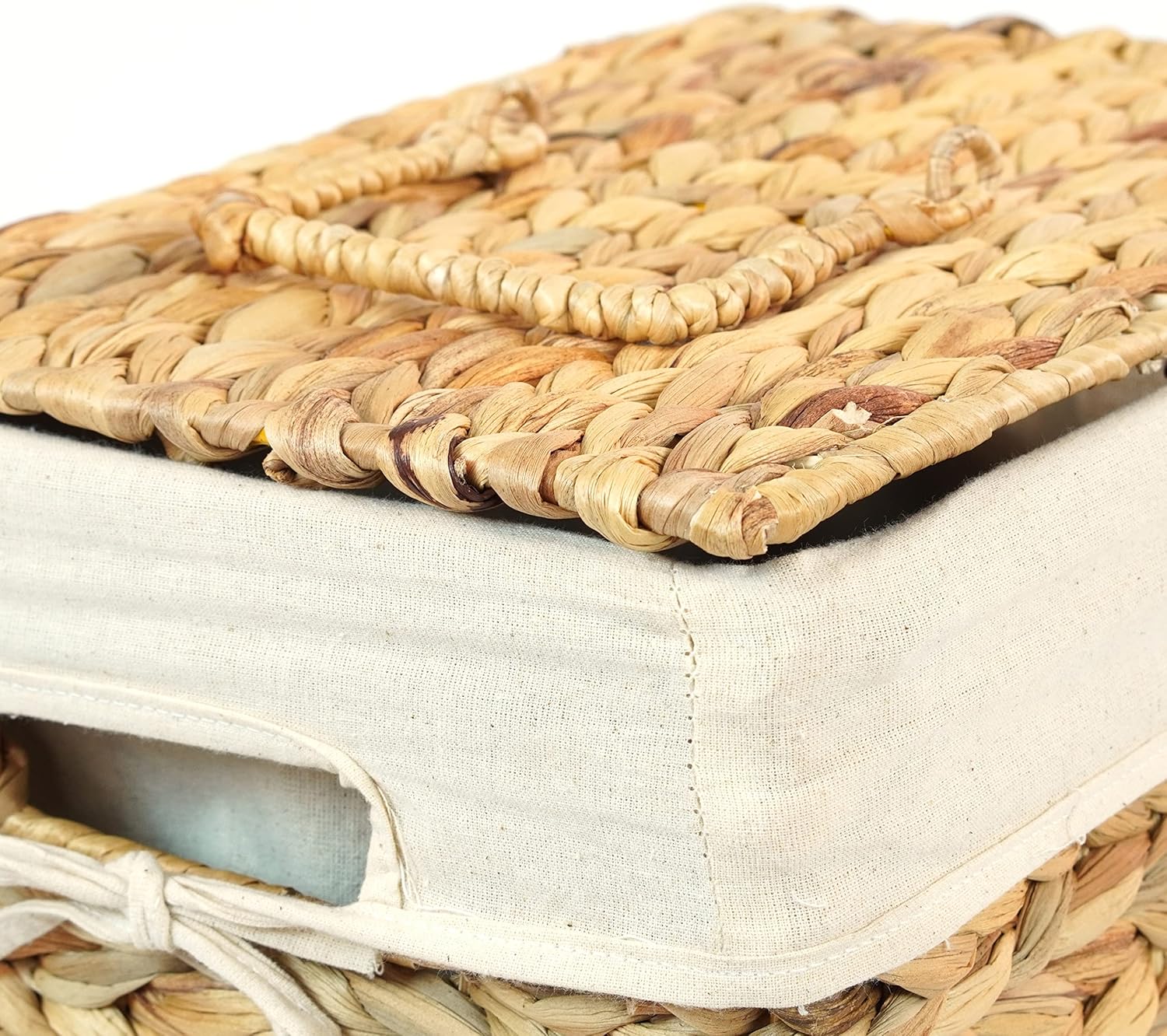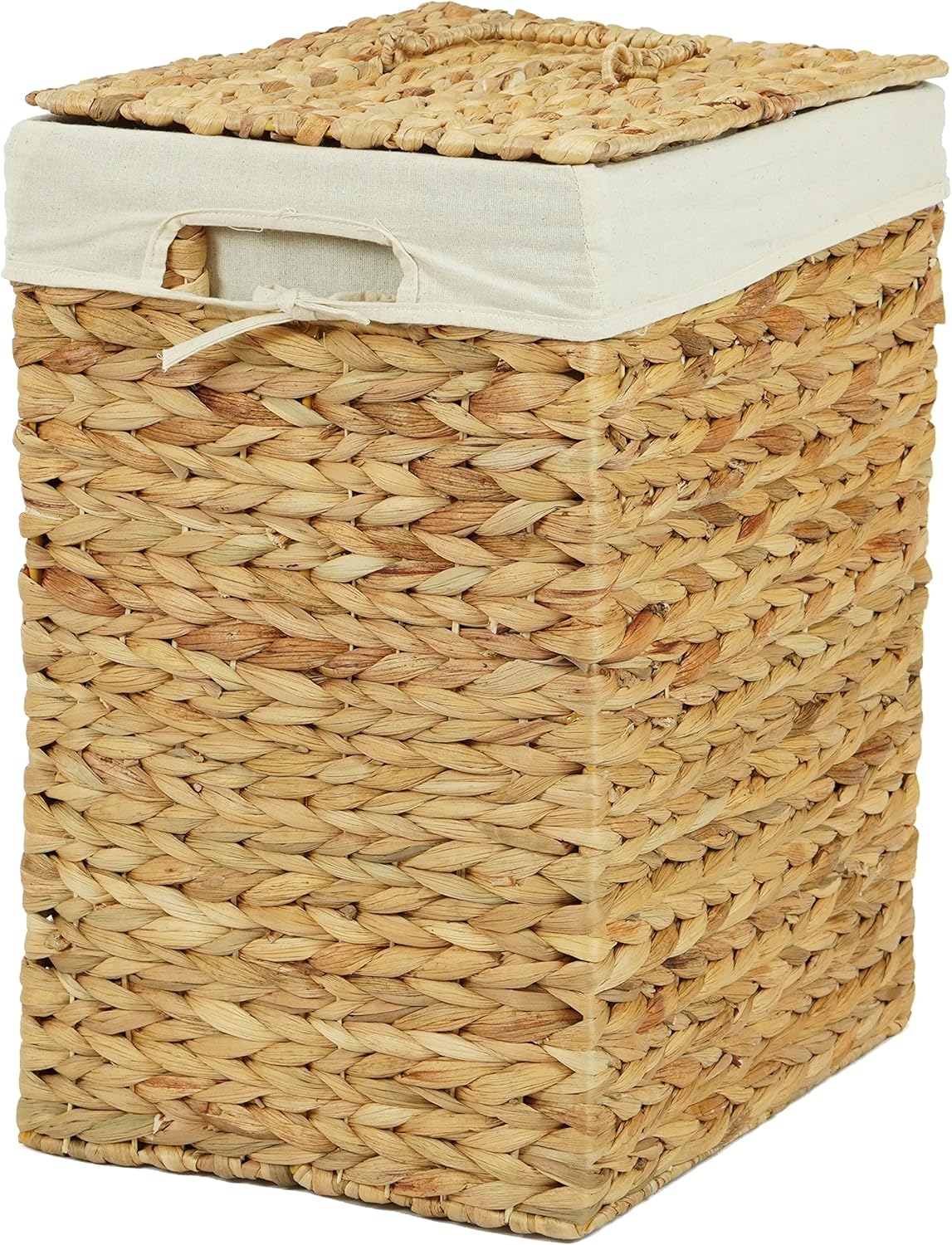 Organize your laundry easily with this beautiful handwoven Water Hyacinth Hamper. Fashioned from natural water hyacinth in a tight wicker weave. Hamper features two cut-out handles on both sides for easy lifting, and a lid that keeps things from getting in and smells from getting out. Beneath the grass weave is a steel frame that provides support for heavy loads while remaining lightweight. Includes a washable lining laundry bag with built-in handles. Use it your way: organize colors and whites easily in your bedroom or laundry room; store them in a closet to keep dirty clothes out of sight; roll them from room to room when it's time to gather linens and blankets.