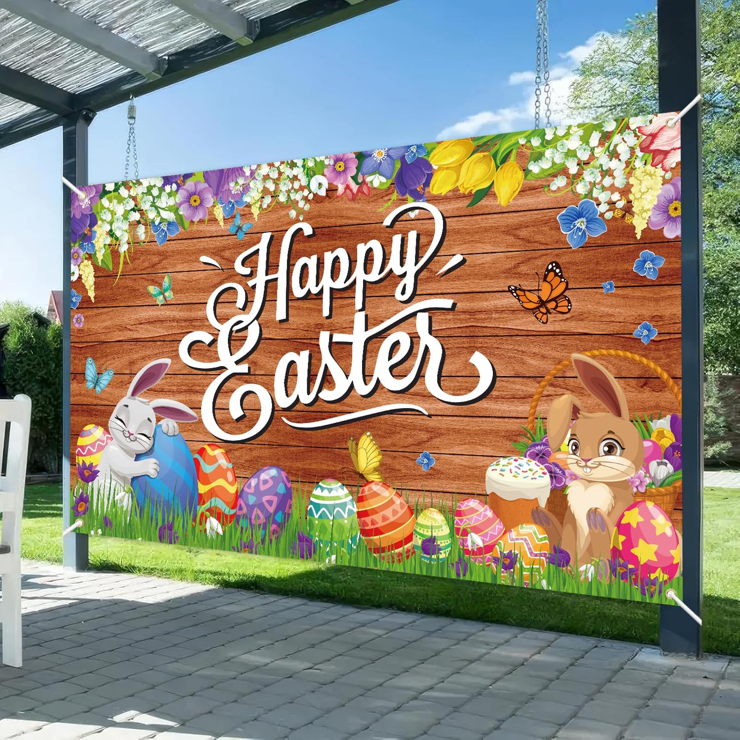 Cute Bunny Easter Theme: Features adorable bunny characters colorful Easter eggs daisy flowers butterflies and festive bunting creating a kids Easter banner spring party backdrop and holiday decoration ideal for egg hunt celebration classroom decor and family gathering