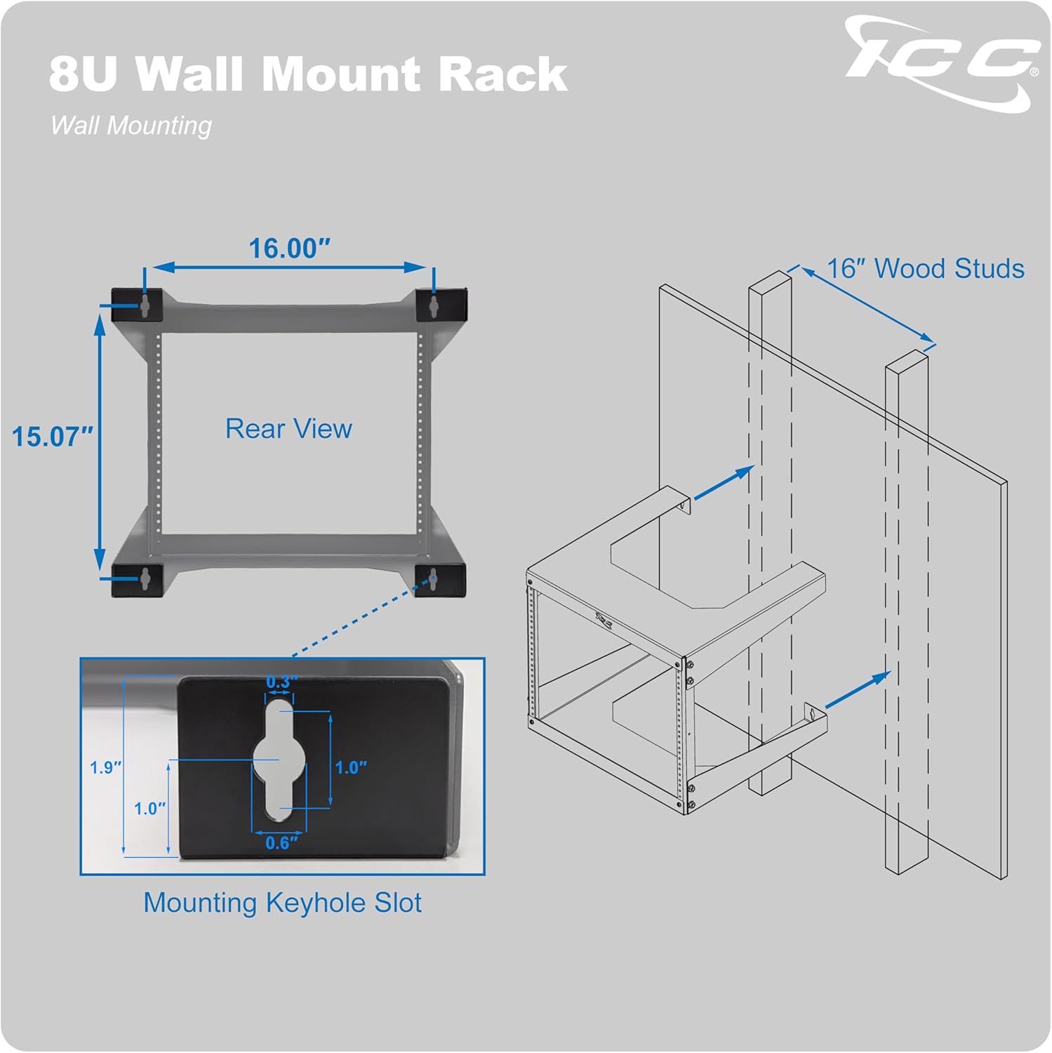 The ICC 8U Wall Mount Open Frame Server Rack is built for small-to-mid-sized network, AV, or telecom installations. It features a heavy-duty cold-rolled steel frame with 14-gauge arms and 11-gauge rack rails, supporting up to 125 pounds of standard 19” equipment. With an 18” depth, the rack accommodates patch panels, switches, shelves, and power distribution units while maintaining a compact wall-mounted footprint. The rails are pre-tapped for #12-24 screws, and the rack ships flat with instructions for fast and easy assembly—ideal for environments where floor space is limited.
