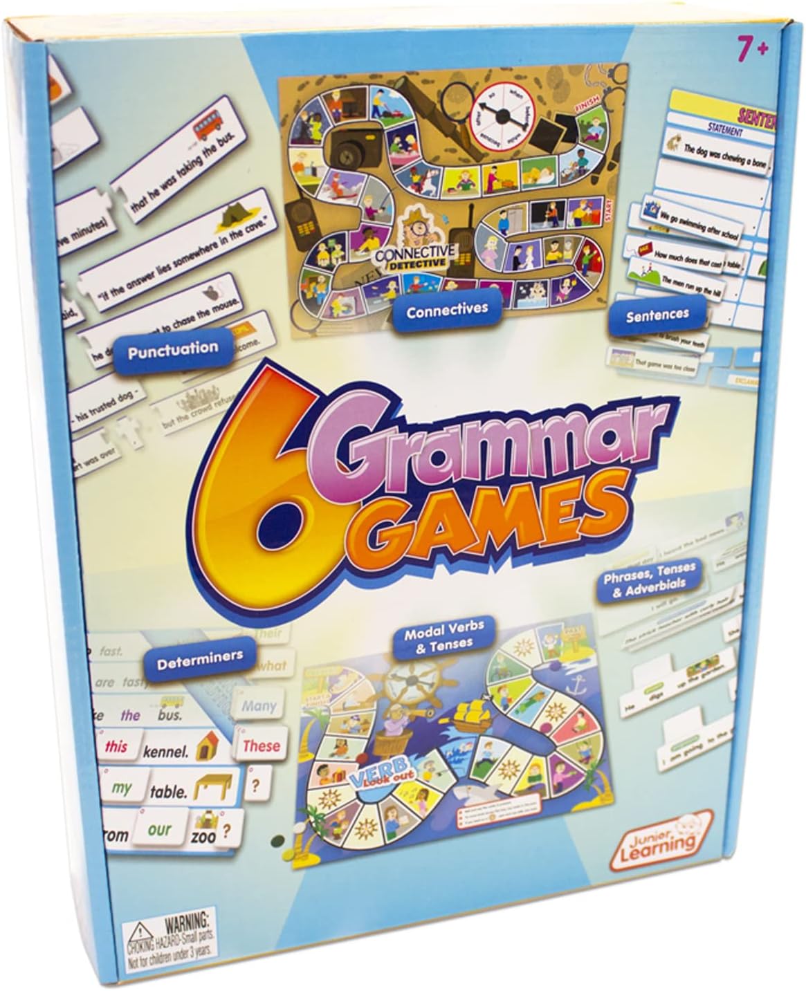 This set of educational games and activities is designed to teach an understanding of grammar. Topics include: punctuation, connectives, sentences, determiners, modal verbs, tenses, phrases and adverbials. This value pack contains 2 board games, 2 matching games, 14 sentence puzzles, die, spinner and counters. Contains a game guide with instructions. Ages 7+.